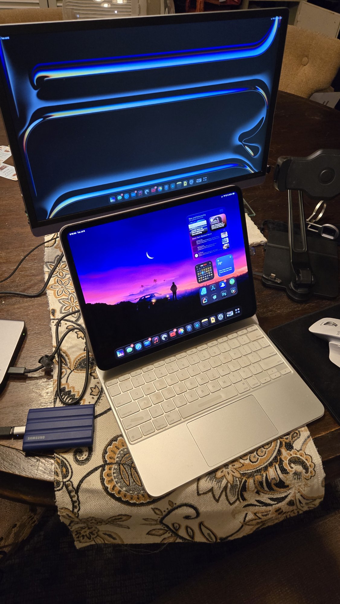 I’m not encountering that issue. I’m on Beta 3, and the desktop monitor is still working with my wallpaper. Perhaps a restart will fix it? 👍🏻. (PS. Lighting is weird in the photo, the two displays don’t look that different in reality, though the monitor is a bit dimmer than the display, possibly my brightness setting or something. 👍🏻)To those using the latest iPadOS 26 (beta 3)… have you experienced any bugs regarding wallpaper not displaying on external display?