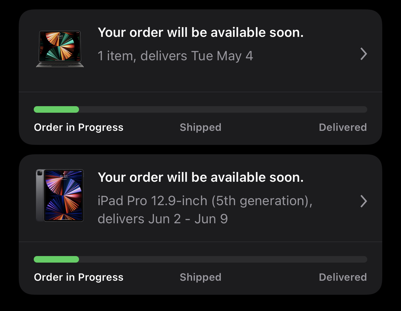Same for me12.9, Silver, 256GB, Wifi, May 21 - May 28 (Czech Republic). Bit of a pain to order, every time I tried to pay it removed the item from the bag and I had to try again, about 6 attempts before it worked.