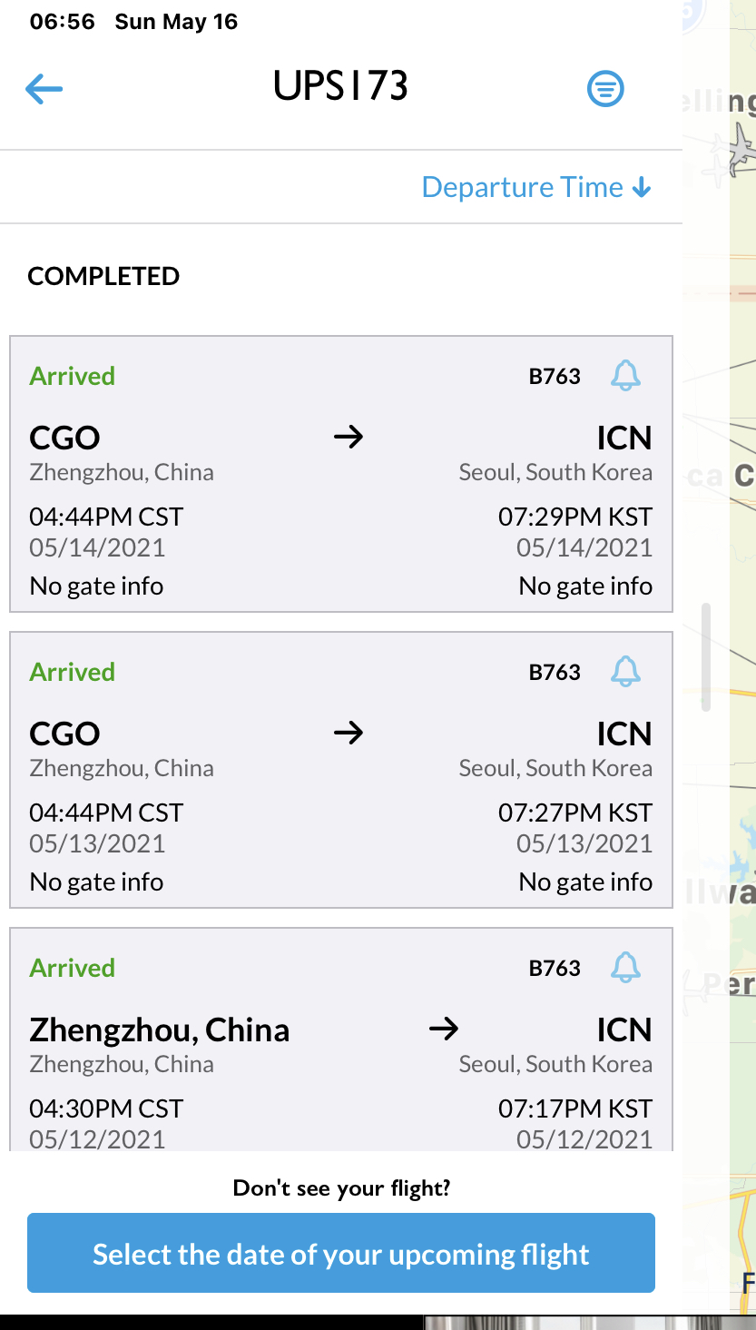 UPS has several cargo flights each week from Zhengzhou to Seoul Inchon and then connecting to Anchorage with several flights per day. Seoul is a huge UPS hub. The UPS flight schedule is impossible to find ahead of time. For my own pre-pandemic business travel I used the FlightAware app that lists to/from schedules worldwide. No UPS flights listed for Sun/Mon yet on the Zhengzhou-Inchon leg. Could be Tuesday before an outgoing UPS flight occurs. Attached below is the latest movement of UPS Flt 173 on the route.Yeah, mine is still chilling in zhengzhou as well. I can’t find any cargo flights from Zhengzhou to Anchorage though.