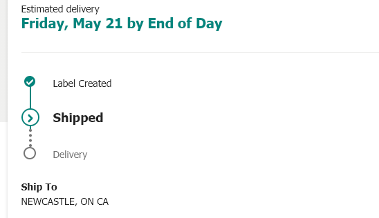 UPS tracking now shows delivery for tomorrow, May 21. 8:43pm scan in Caledon. Delivering to Richmond Hill, Ontario.Order shipped, delivery on Apple now May 21. UPS no date. Shipping to Richmond Hill, ON.