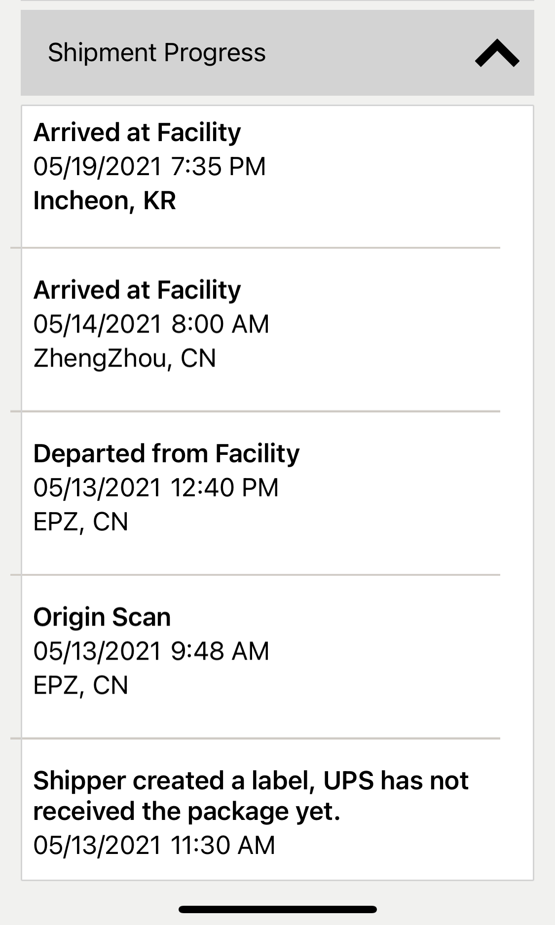 Yes, I did go back to around page 40 of 92 in this thread, just to check on those from the earliest group that got theirs on May 21. It seems that they arrived in Zhengzhou on Friday, May 14, at 8:00 in a big group. They sat all weekend, and then a good portion of them left between 4-6 PM China time Monday, to arrive in Korea a few hours later. From there, they went to Alaska. I couldn’t find the ones that you mentioned with a missing departure scan.