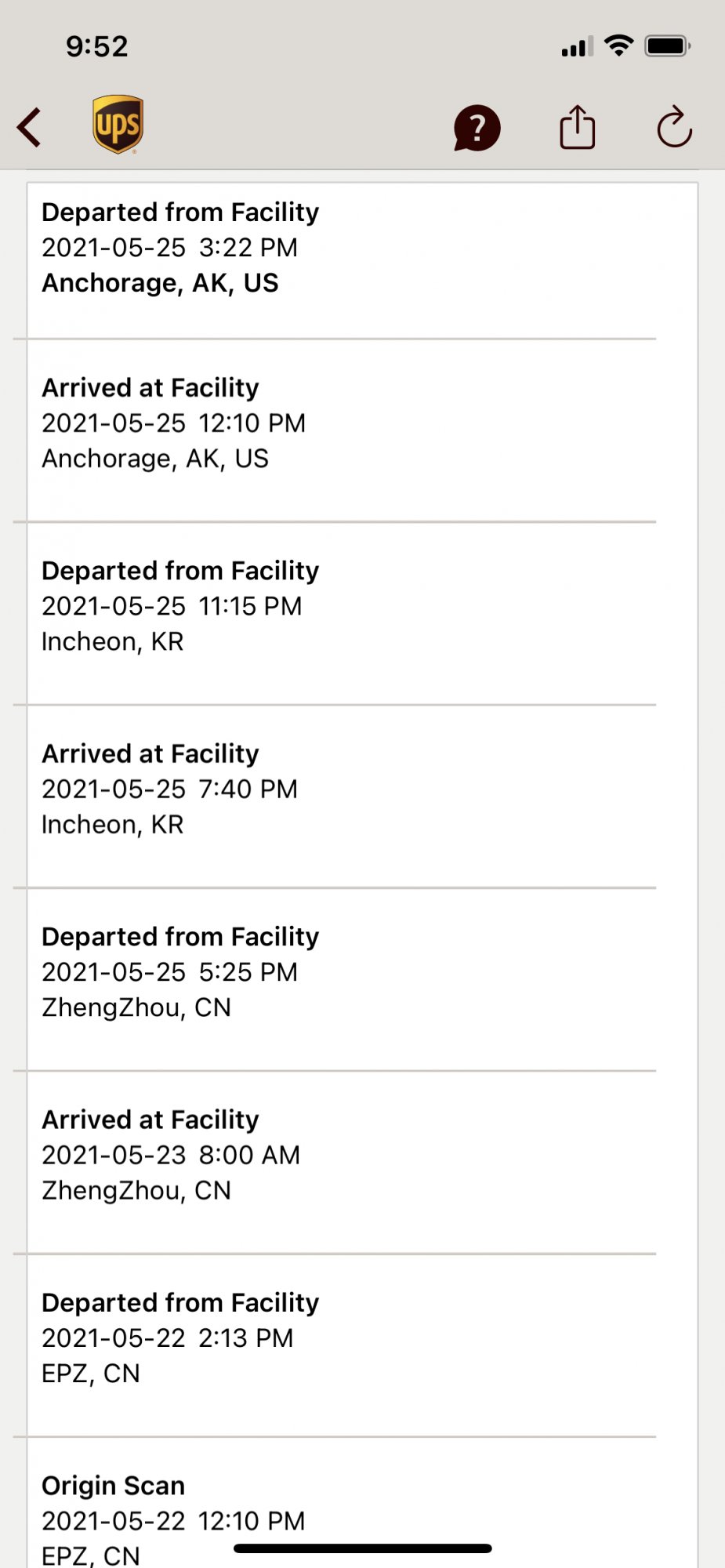 Hopefully yours just arrived in Incheon with mine, looks like they left a pallet by accident yesterday in ZhengZhou, and we're a day late (but a week ahead of Apple's promise date)Well so much for the missed scans theory. Thanks for nothing UPS.