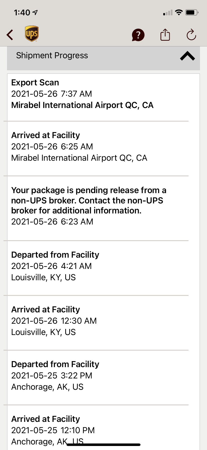 I’m actually worried that somehow, something went wrong with the customs stuff. It arrived in Montreal OK, a couple of minutes after that earlier clearance scan, but about an hour later, I got that “export scan”. It was already in Canada at the time, so that scan would indicate that it’s going to be sent back out of the country. Who knows, but it doesn’t seem right.