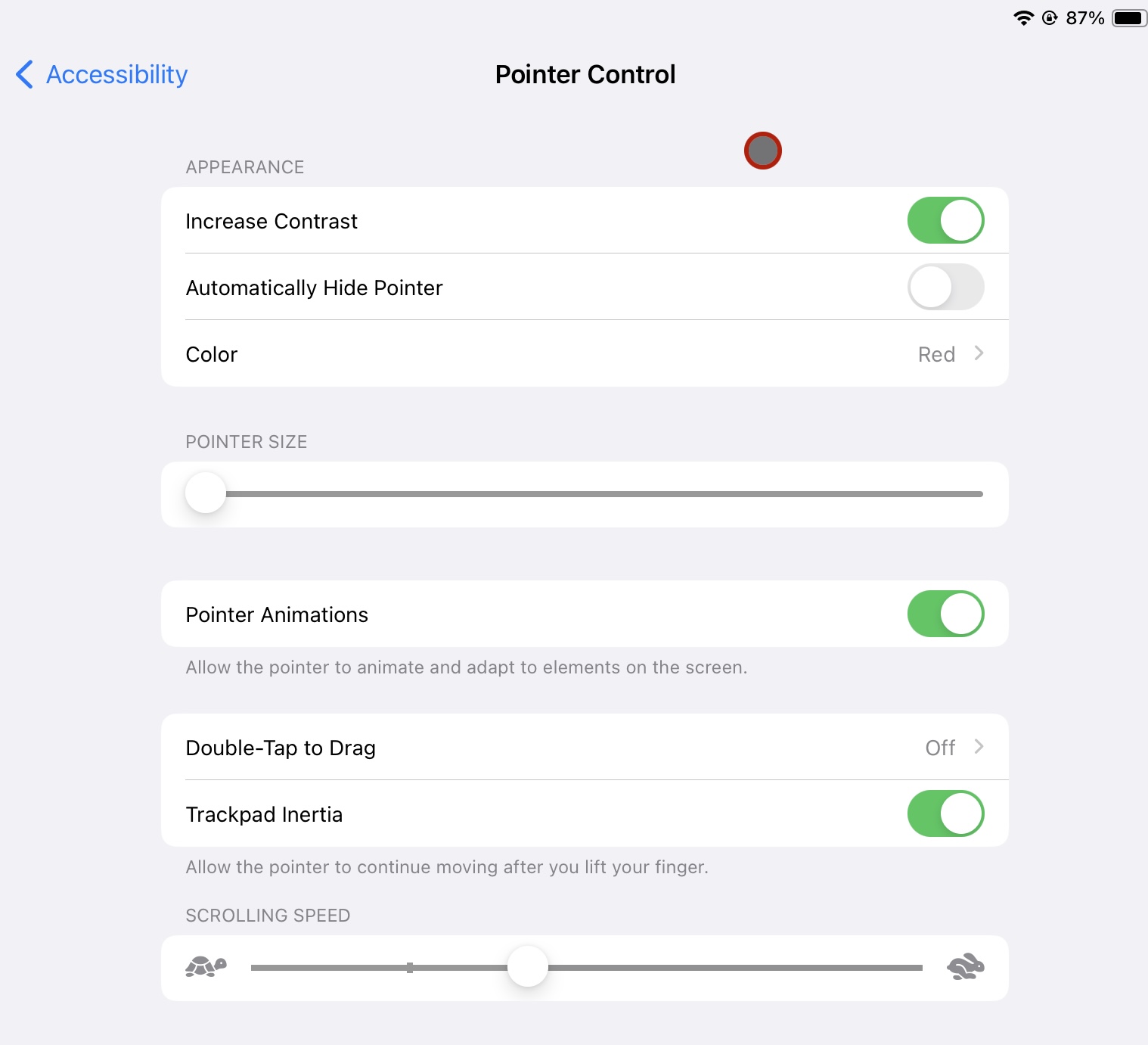 My daughter has switched from a laptop to iPad, but is struggling with the grey dot instead of having an arrow Pointer.