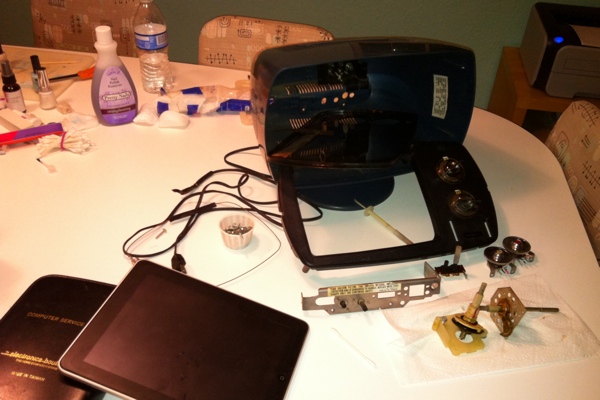 STEP 6. FINISHING TOUCHES. From this point on, things moved quickly. I attached the rear adjustment knobs to the chassis rail and then using the original screws, attached the TV case to the rail... exposing the knobs exactly where they were supposed to be. I used florist wire (thin aluminum wire used by florists to create floral arrangements) to secure some of the free floating knobs to the chassis. I attached the terminal block for the telescopic antenna in its opening. I used E6000 glue to attach the power slider-switch to the bezel from inside.