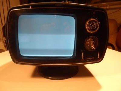 This TV started life out as a 1975 Philco B&W portable TV model B370FBL. It featured a 9" diagonal picture, and all of the manual controls that were standard for TV sets in the 70's. It had a curvy egg-shaped shell that seemed more suitable for the 1960's or maybe late 50's. It had very Jetson's-like qualities.