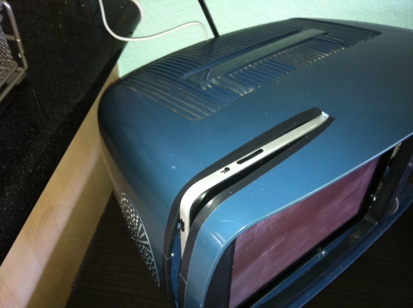 STEP 4. "STUFF" HAPPENS. Once the housing was separated from the rest of the chassis and components I was able to match the iPad up with the opening. It was a perfect fit... IF the iPad were to be centered in the opening. But because the housing was curved and the opening in the bezel was offset, it turned out that the iPad was too large to fit completely inside the TV housing. Had this been a more traditional rectangular case, the iPad would've fit completely and perfectly within. But this egg-type Jetsons TV offered less room. This meant that I'd have to cut an opening in the housing. Since the opening in the bezel for the screen was vertically centered that meant that a top or bottom cut would not allow the iPad to be centered in the bezel opening. The only option was a slot on the side.