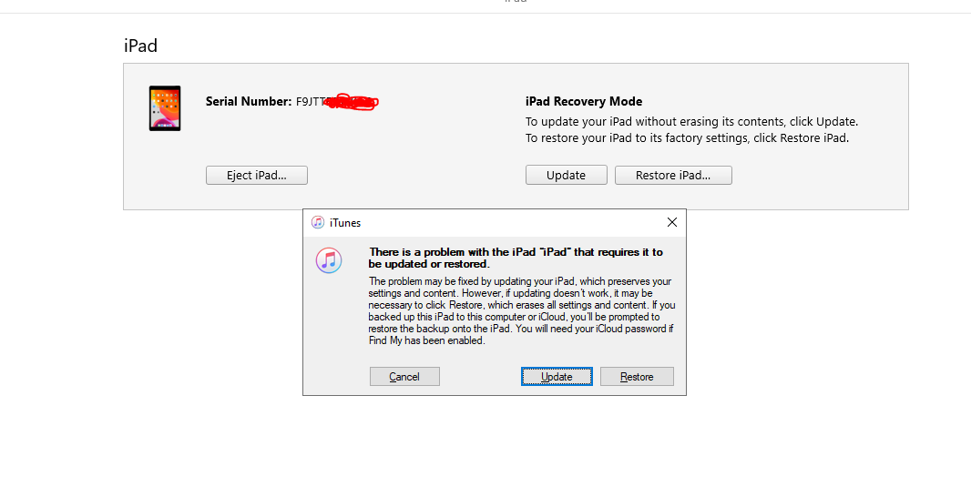 I took it home to try to fix it, When I open iTunes and connect it, it says it needs to update, and if it can't update it needs to restore.