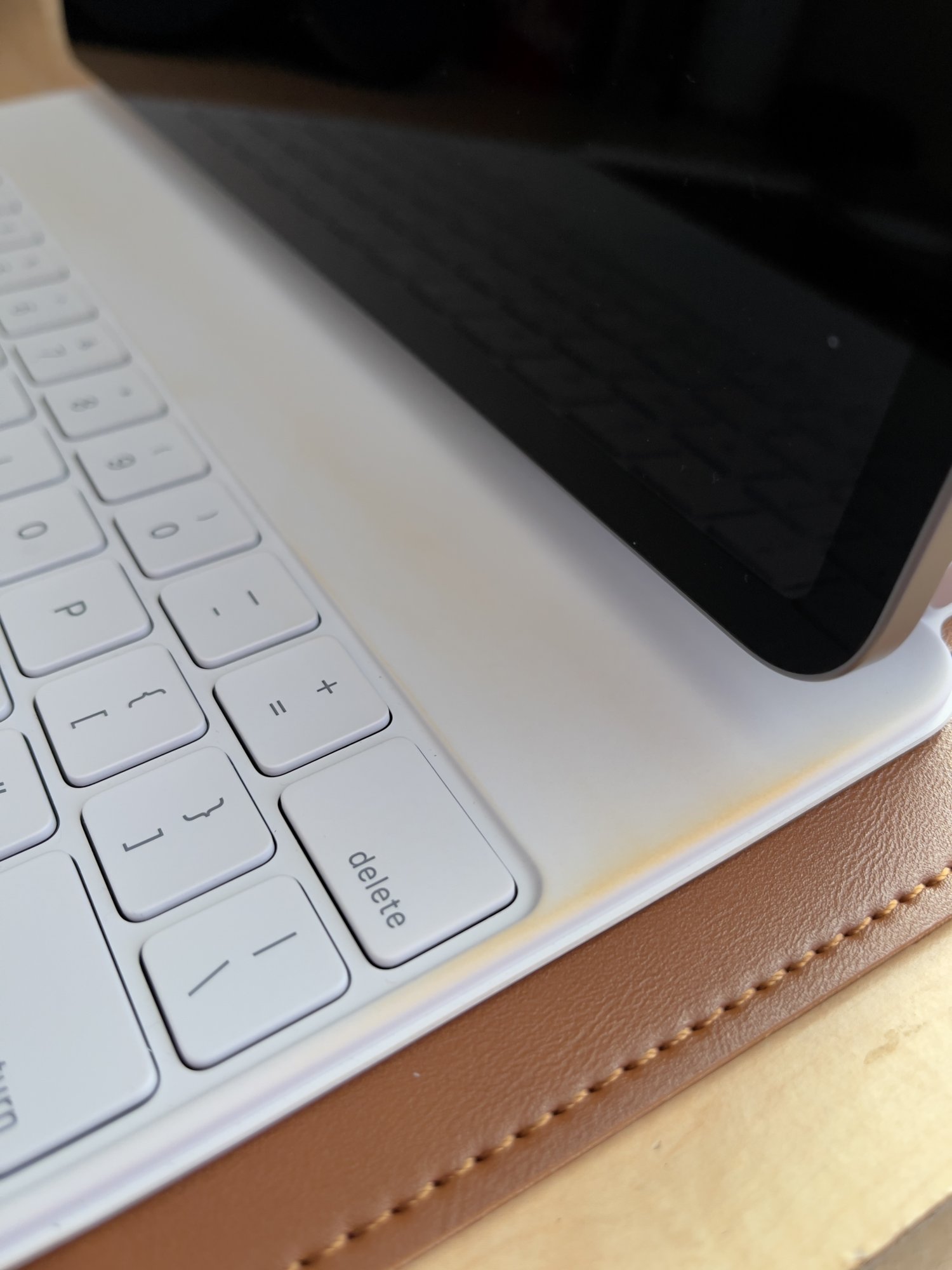 Hello all. Just got the White Magic Keyboard for my 12.9" iPad Pro 2021 as a gift. Yesterday morning, I saw discolouration on the top inside and sides of the keyboard. That was weird because I made sure my hands were clean before using it. And I never reach those surffaces. Keys and the trackpad are all intact.