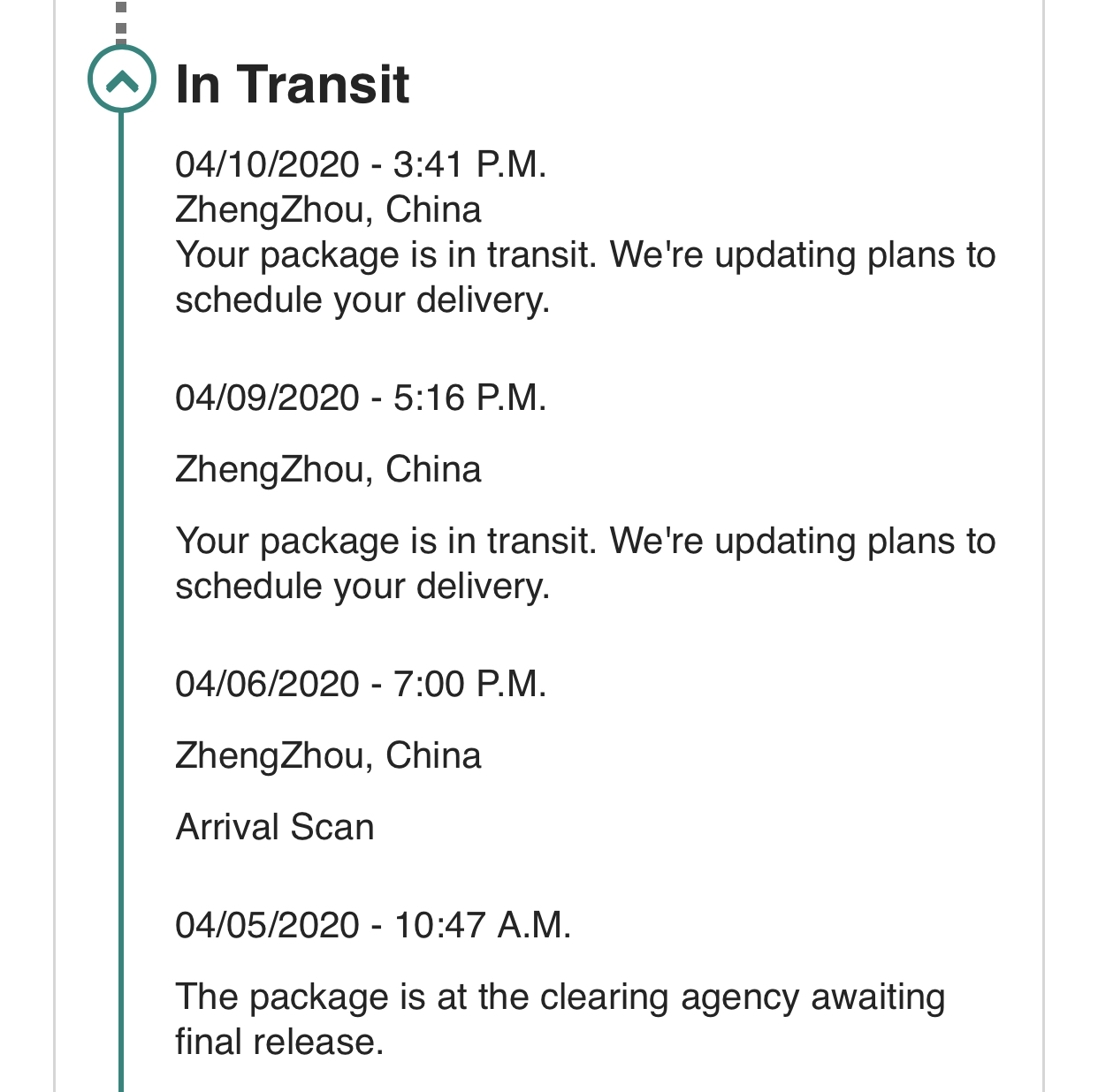 My label created and iPad Pro shipped on the 5th. First said delivery date was April 14th, next day dropped to the 10th and I got super excited. Then the status has changed to “rescheduling delivery”. It’s been hanging out in Zhengzhou China since.