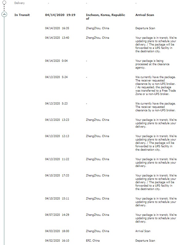 • 2020/04/02 - 11:17 (Timezone unclear) - Requested clearance by a non-UPS broker