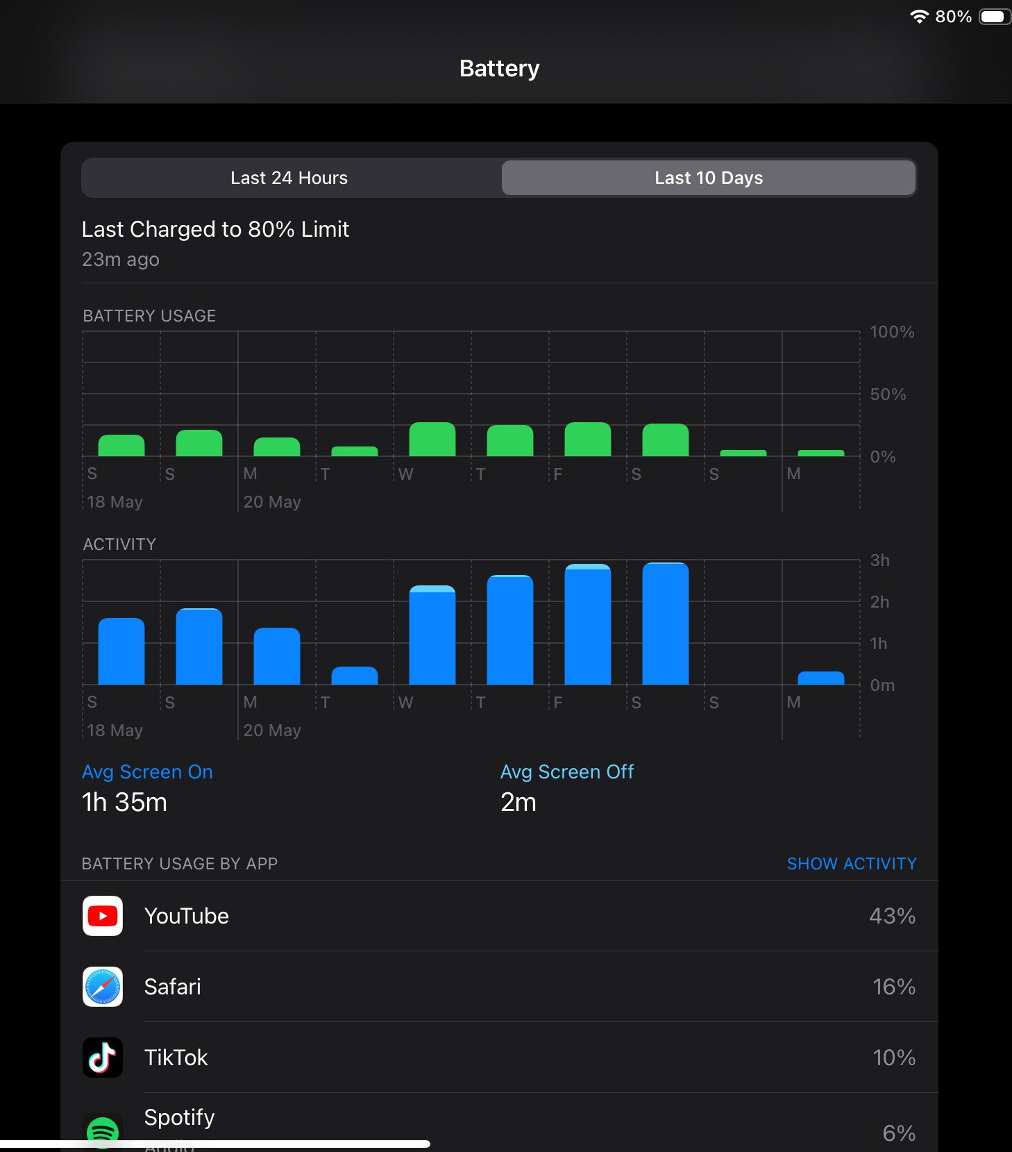 I have had my iPad Pro 11 M4 for just under a week. I left it set to charge to 80% but I find it runs down much quicker than my previous 3 year old iPad Pro 11. The old one would last all day. Using the new one the same I am lucky to get to late afternoon before having to charge it up. The critical message comes up. I nave now switched off the 80% control and will see how it fairs charged to 100%. There is no doubt it needs more power.