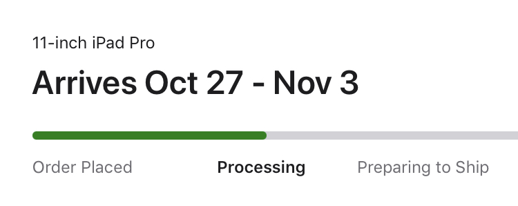 Argos & John Lewis had stock for delivery this week. I placed an order Monday 26th Oct and got it 24 hours later.Thought I'd join in the fun here. In the UK and placed an order for a silver 128GB iPad Pro 11 inch. Placed the order last night on the 26th and my estimated delivery dates are Nov 10-17. Was hoping to get it between the 2nd - 6th because I have a week off, but oh well! and based on what I've seen in these threads, no one is getting theirs early!