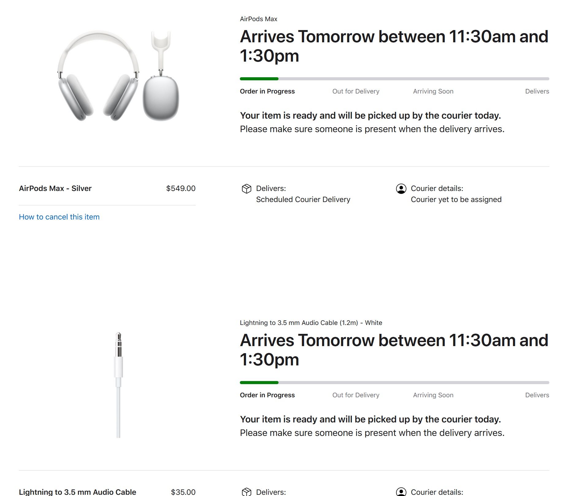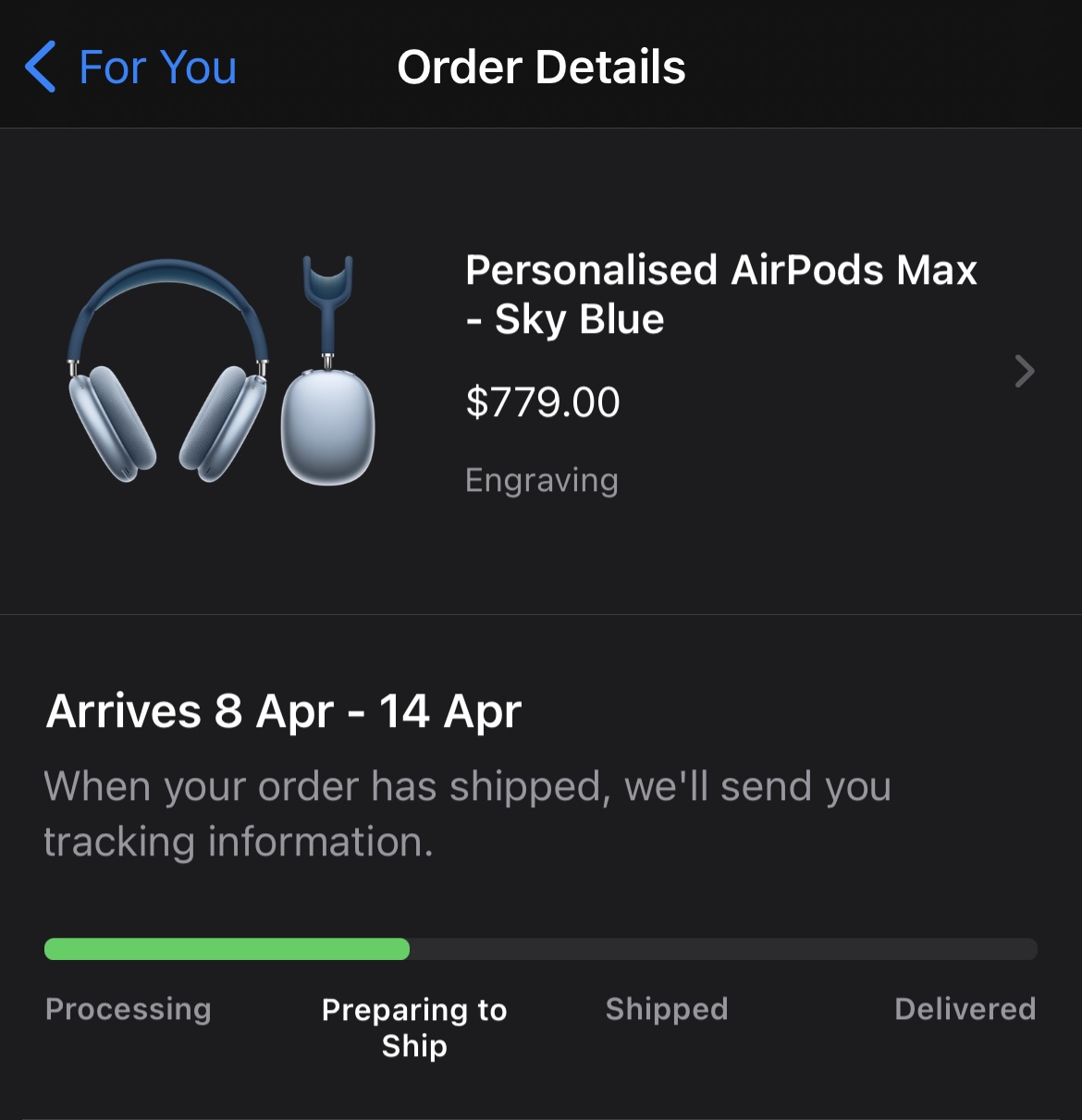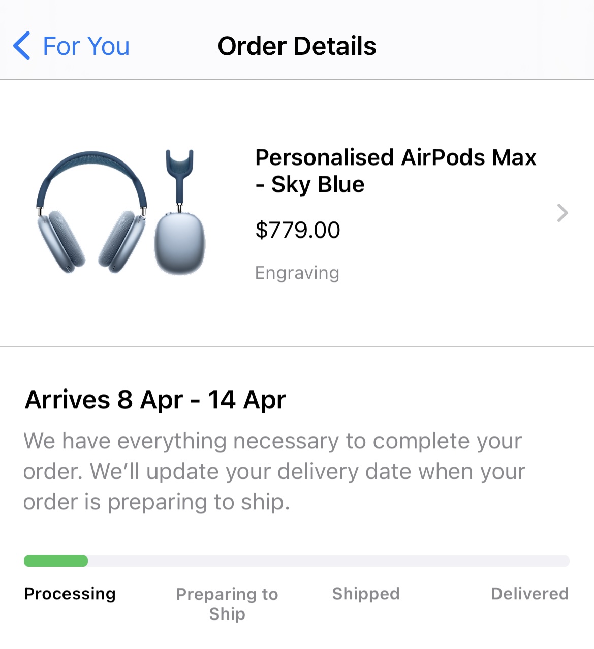 Also, I had cancelled my order for a green pair of engraved AirPods Max out of concern of the lighter coloured headband potentially getting dirty easily. I've since placed a new order for a Sky Blue pair which has a dark blue headband which should hopefully keep clean better over time. It should arrive between April 8 to 14!