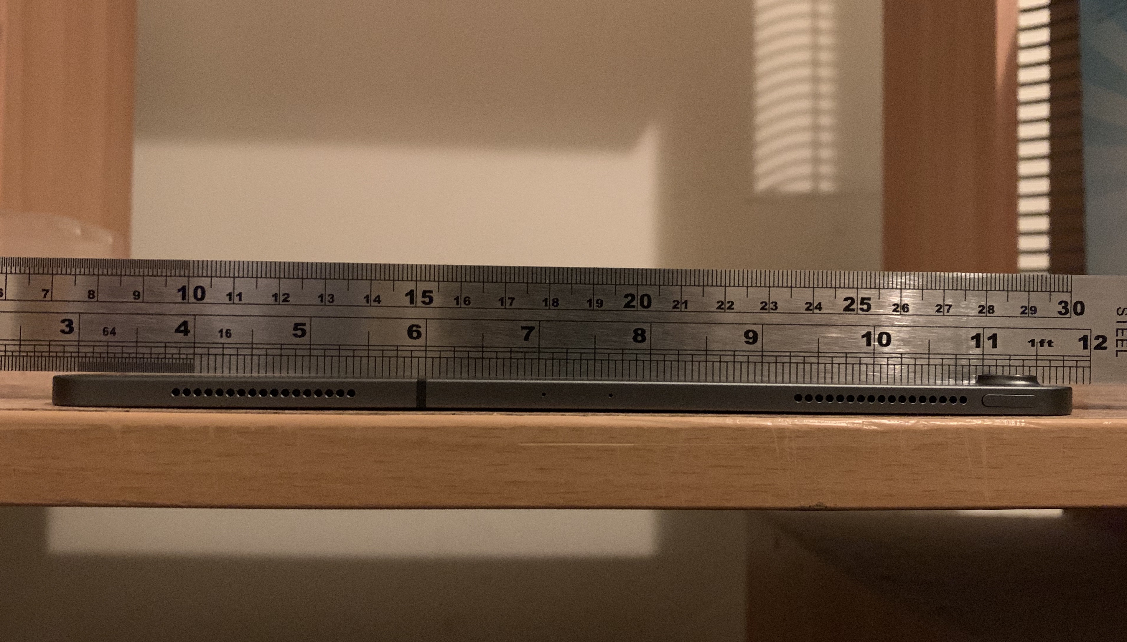 I have attached a picture of the iPad laying flat on a table surface with a ruler along the top of it. Notice how the bend starts at the antenna band!