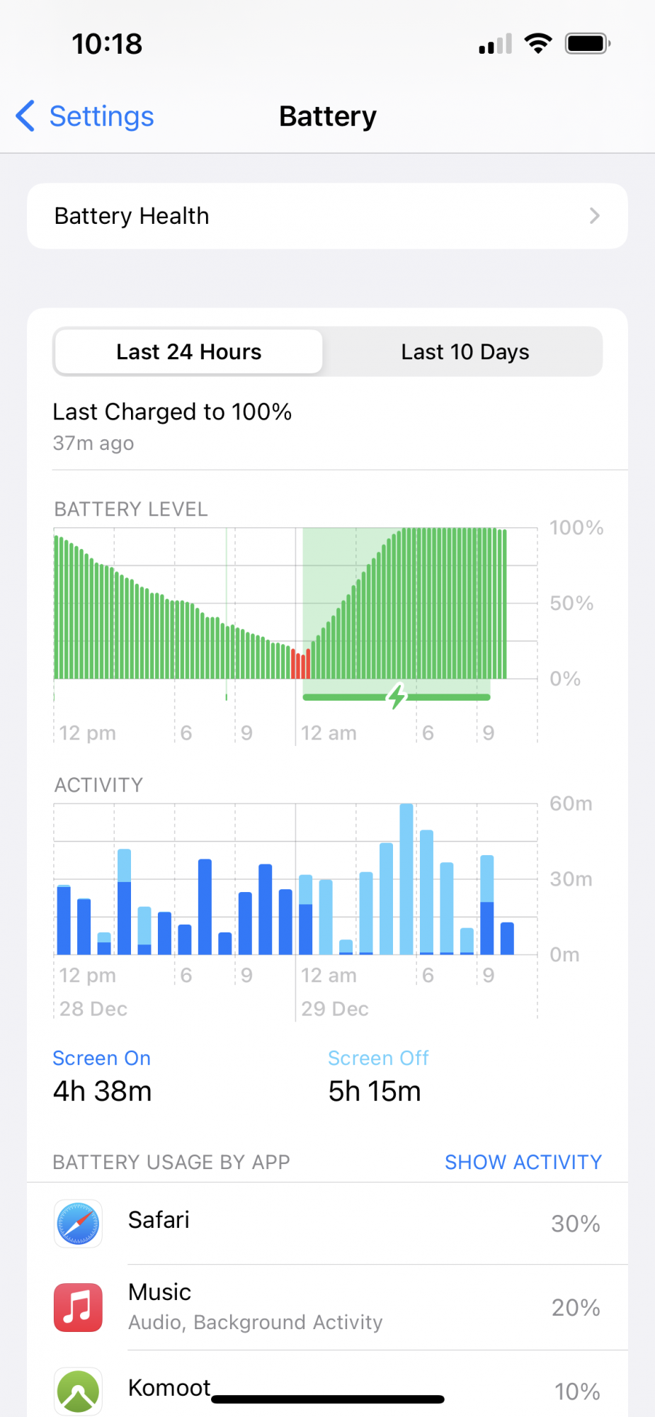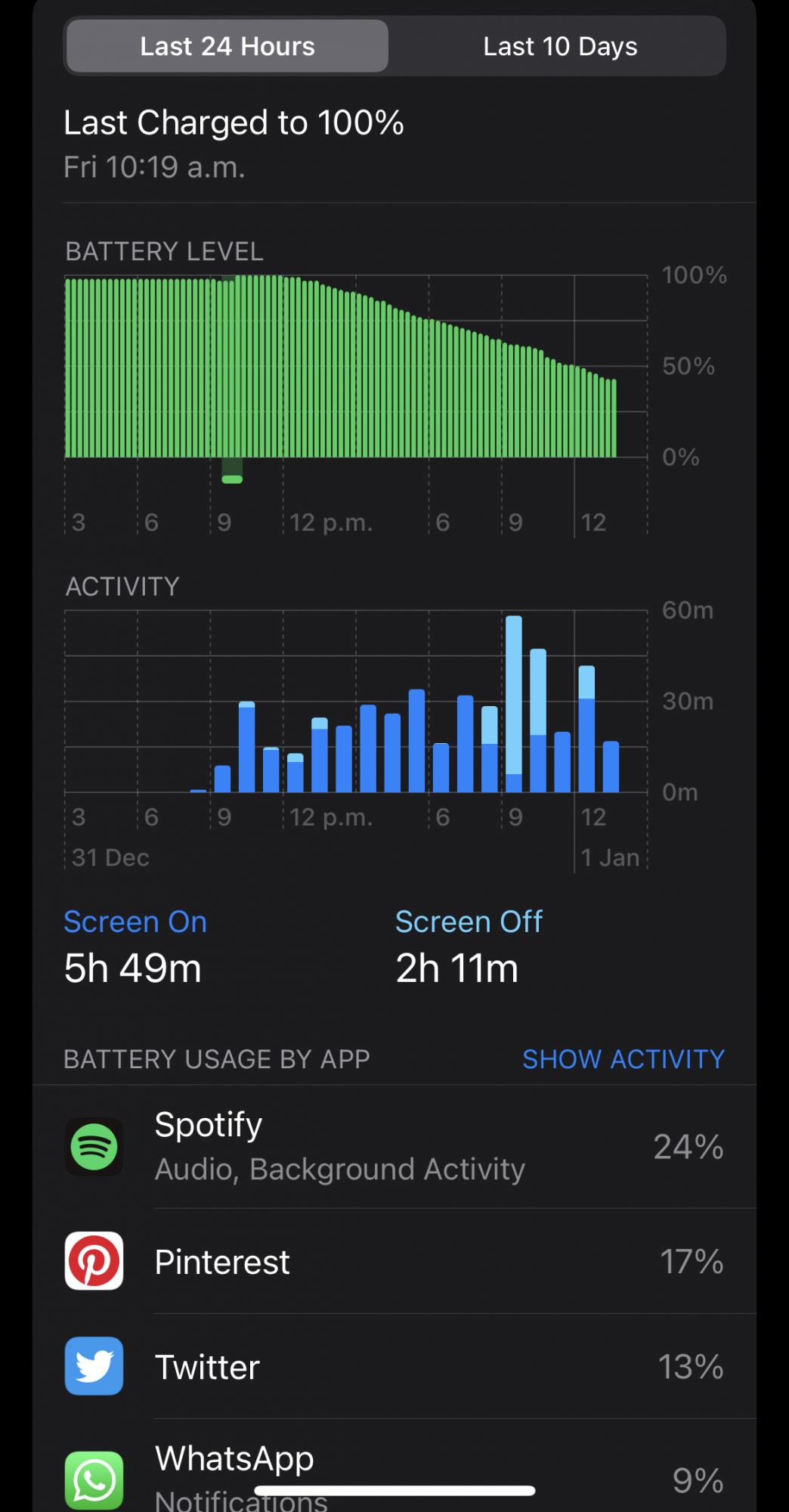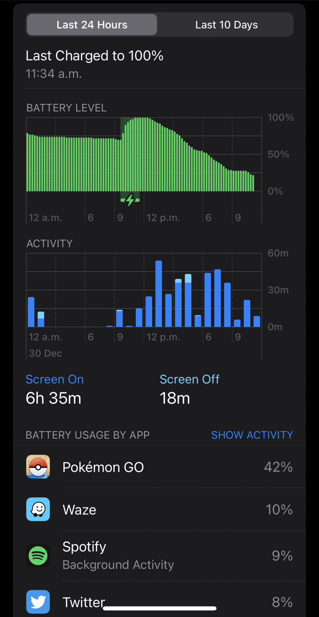 That’s the whole point of the last 10 days. It’s basically how much you used your device and the percentage drop regardless of how many times you partially charge it during the day. It’s the aggregate of all the percentage drops during that 24 hr period.Is there actually a reason why Apple only shows the last 24 hours?