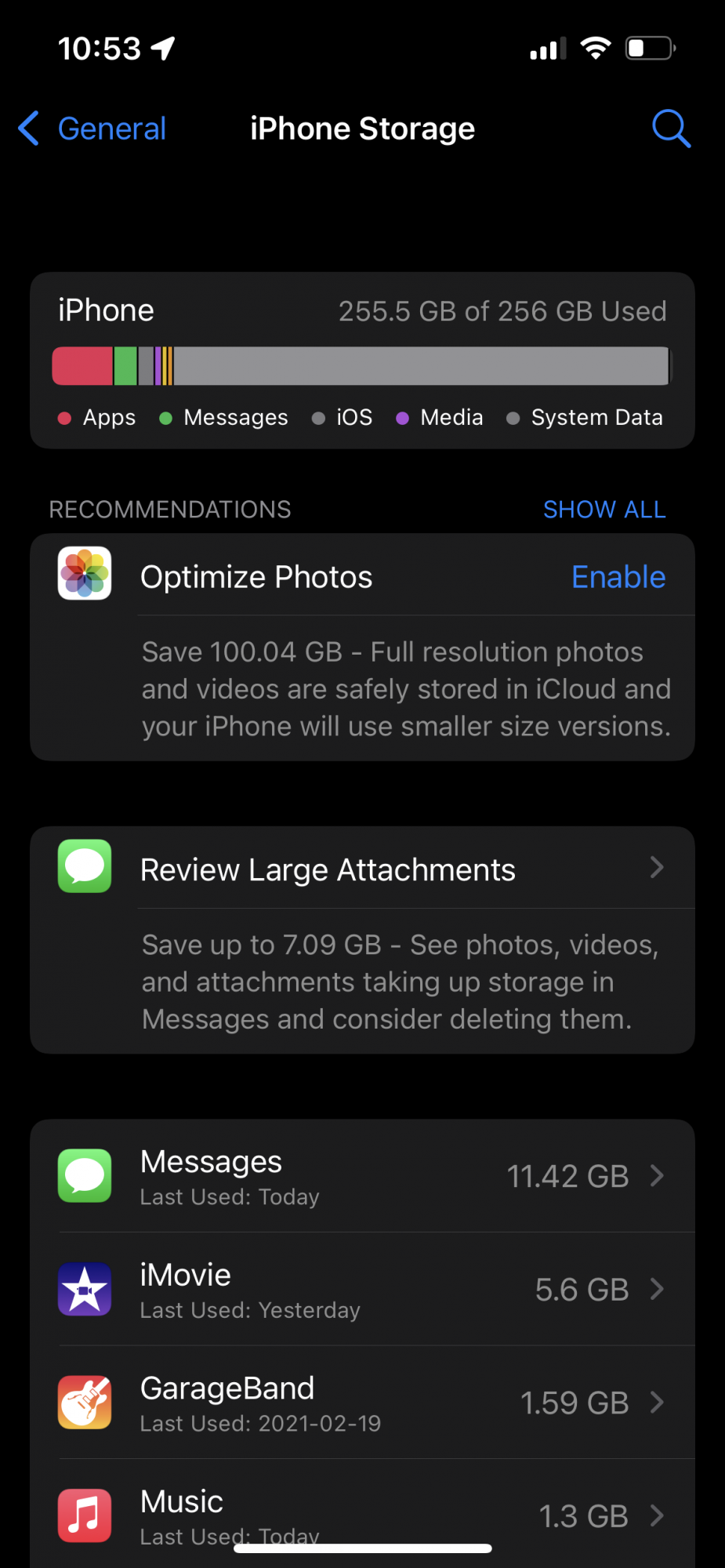Last night I could not open my phone. Every time I swiped up to unlock, the screen would turn black with a tiny spinning wheel in the middle then it would go back to the lock screen. After a few attempts I swiped to the right and it opened the camera. It then showed the message “iPhone storage is full. Free up storage space if you want to take more photos” (or something like that). I then checked my storage and it was mostly grey for iOS and System Data. I think I should have had at least 40GB free but I can’t remember exactly. So I deleted over 10GB worth of message data and photos, but a few hours later it shows storage nearly completely full again. Is this happening to anyone else? All I can find are people getting the storage full message but actually having lots of free space.