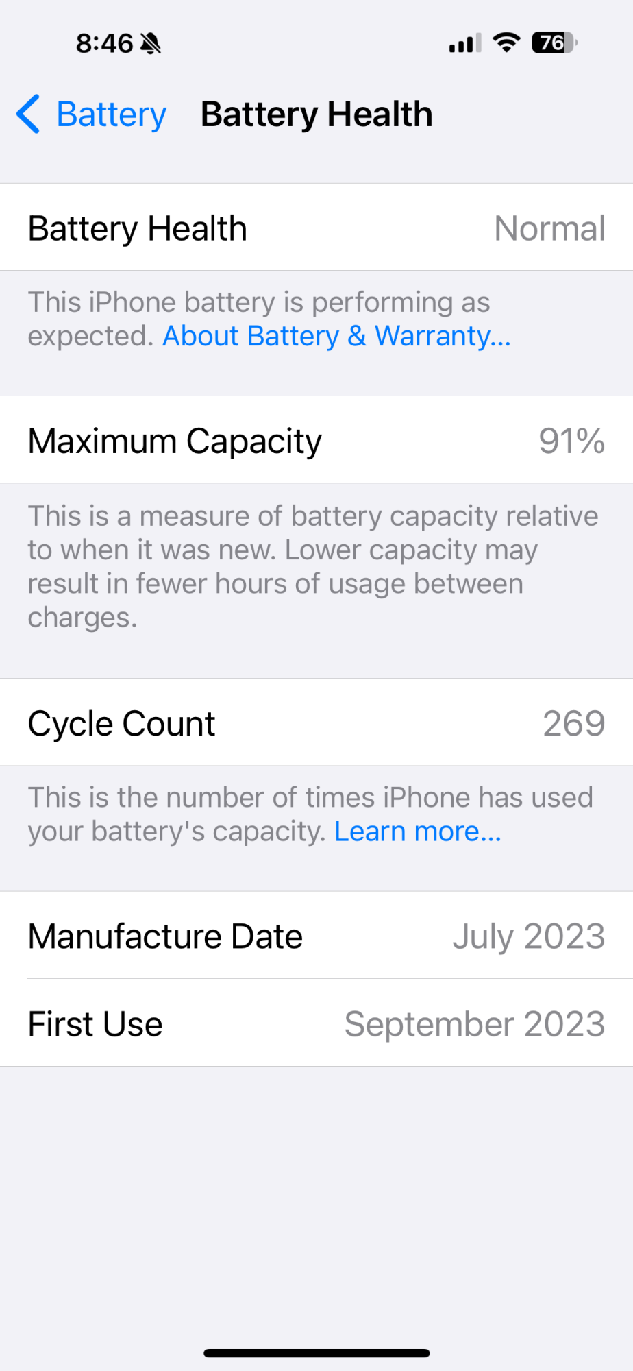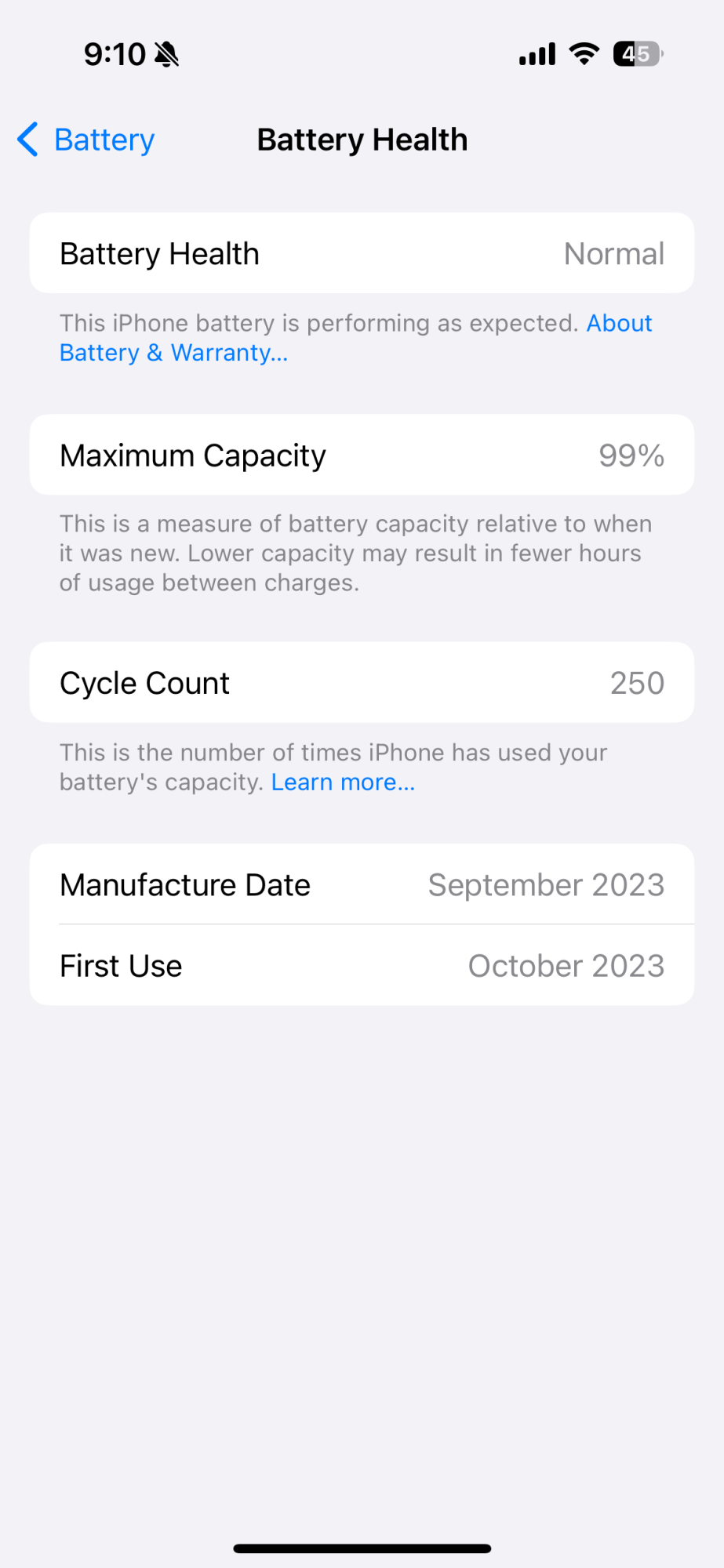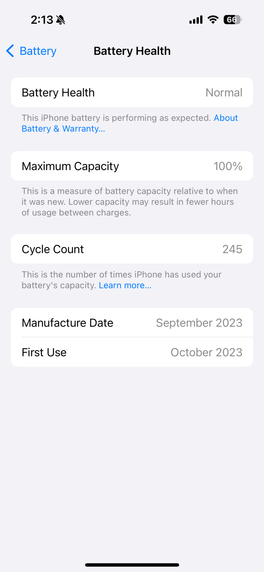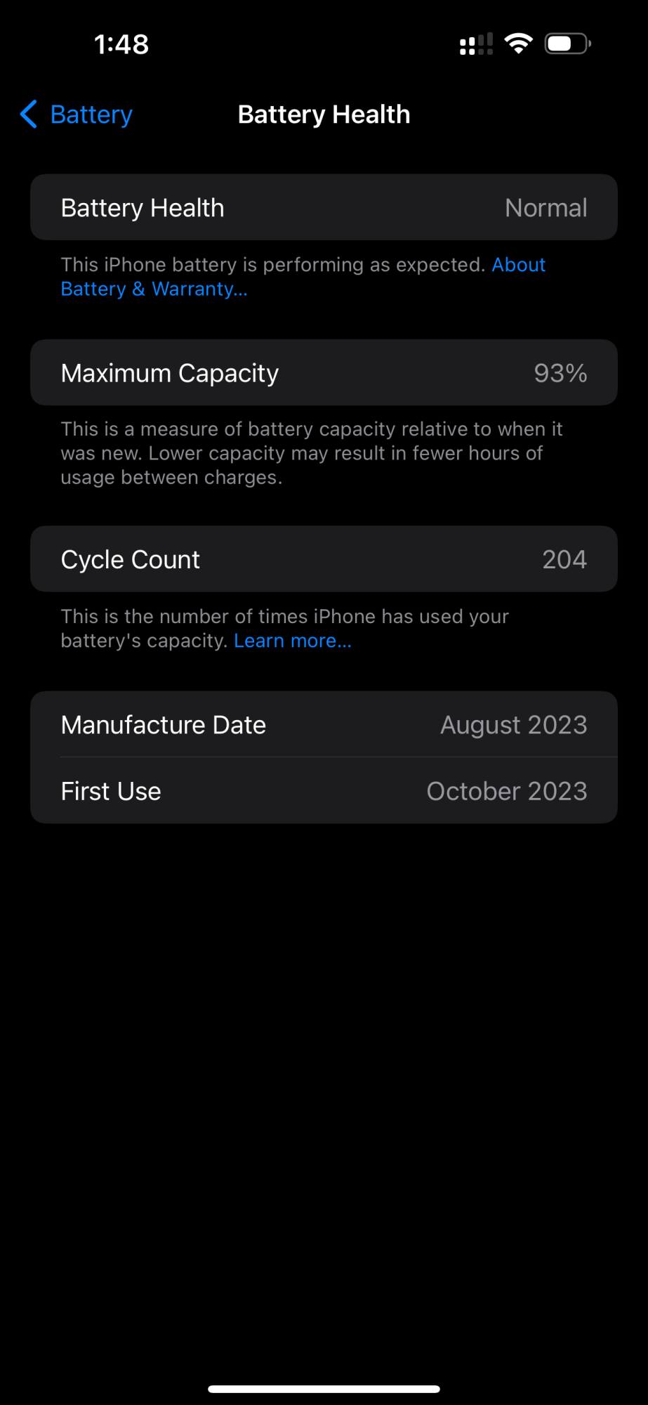 Now my battery health is down to 95% with 216 cycles. All of a sudden, it started dropping quickly. Fortunately, I’m not noticing any difference in battery life when it comes to day-to-day usage.Just noticed that my launch day 15PM dropped to 97% at 206 cycles, after hanging at 99% for a few months.
