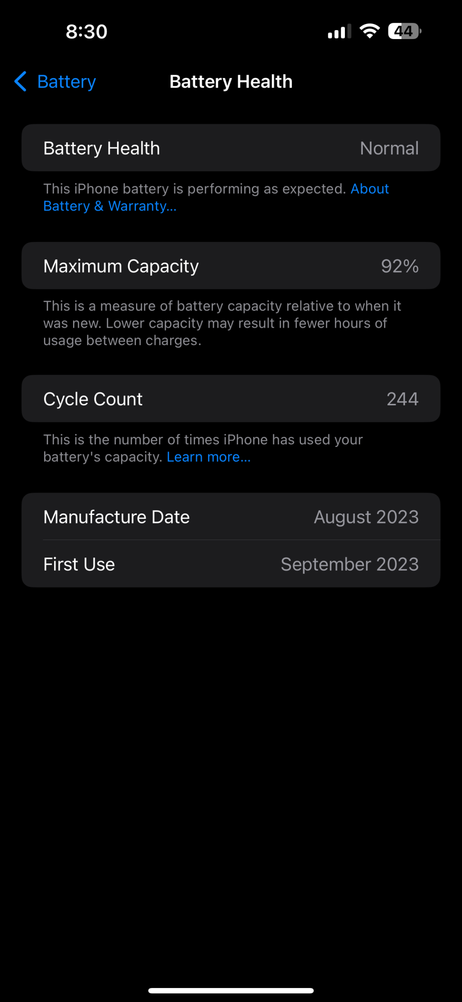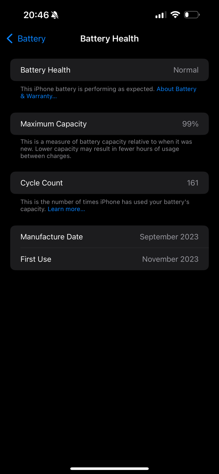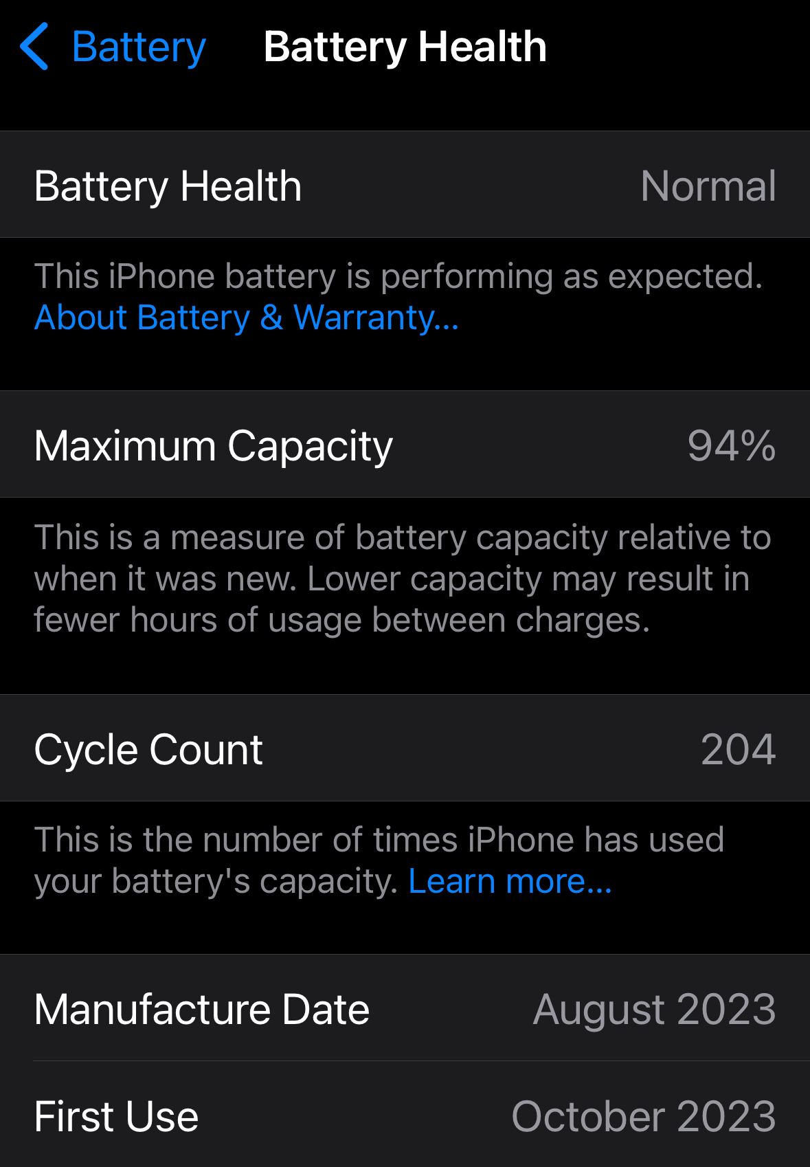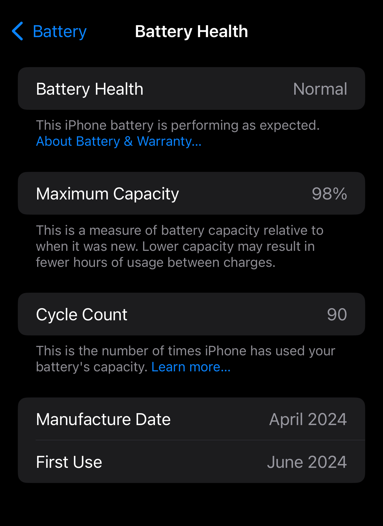 Definitely type of use. My phone is always connected to my power bank throughout the day, and when I reach work, it’s immediately connected to my laptop. My phone has never been below 90%, and heavy gaming also contributes to the degradation. Sometimes I even leave my phone on for specific idle games overnight.Im surprised to see not only you but many that have this battery health with half as much cycles as other people that even have better health. I wonder why this is, if its due to the owner’s type of use, quality of charger and/or charge, quality of battery, country used and average temperature.