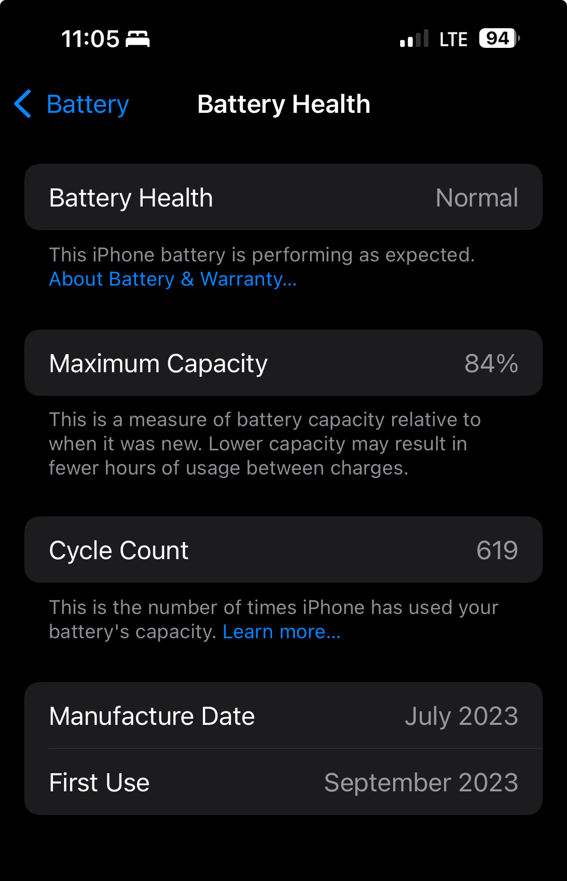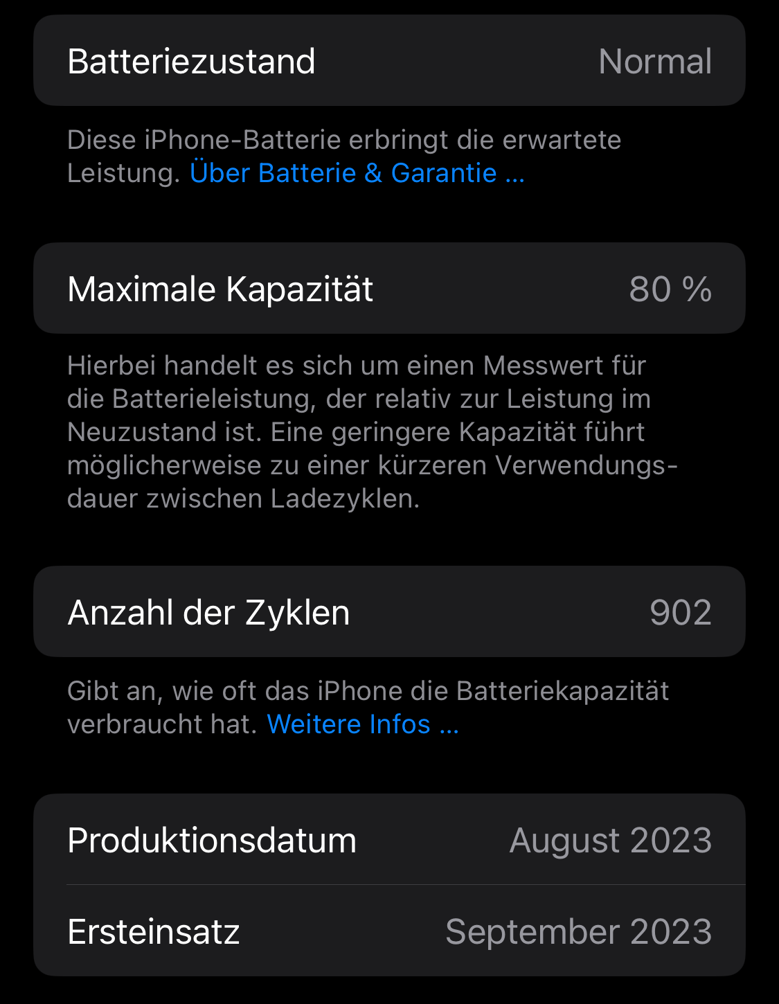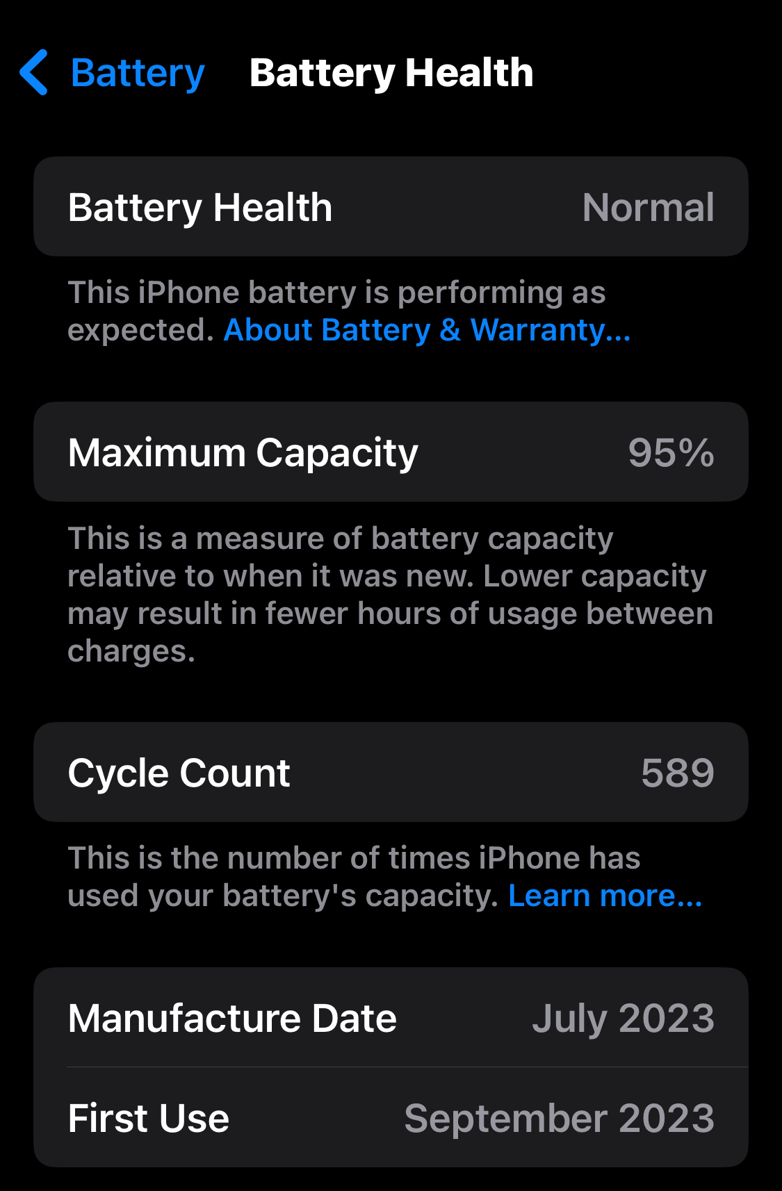 I got my 15 Pro Max Christmas of 2023. It’s now at 88% Max battery capacity with 317 cycles. A month ago it was at 91%. That seems pretty terrible compared to every order iPhone I’ve ever had. My wife says who cares just buy the 17 when it comes out, but it bugs me because I’ve used the 80% charging max and I’ve never wirelessly charged it. I think I’m going to try to calibrate it by running it down to dead and then charging it to 100%. Seems I have little to lose at this point.