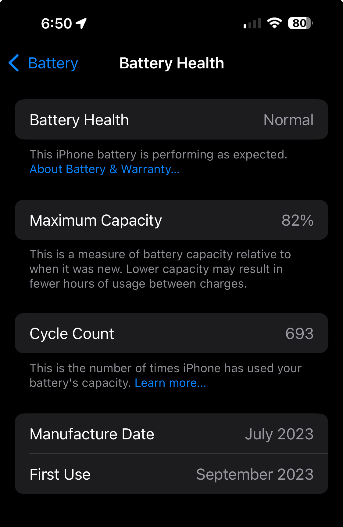 Ya’ll make my battery health look amazing at 82% with 690 cycles 😂And 83% with 355 cycles 😂