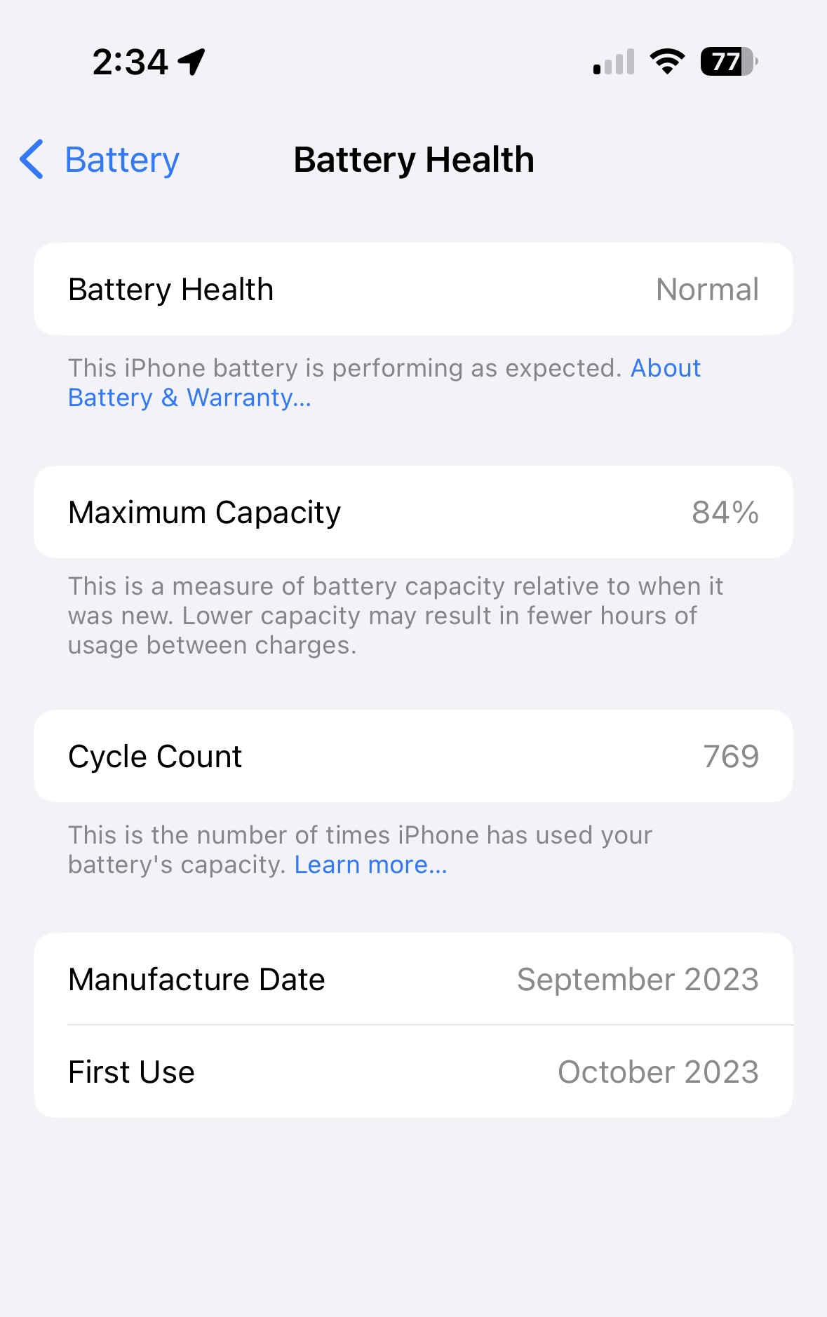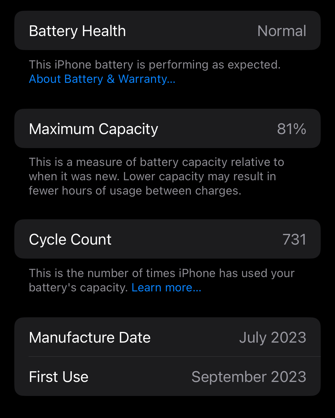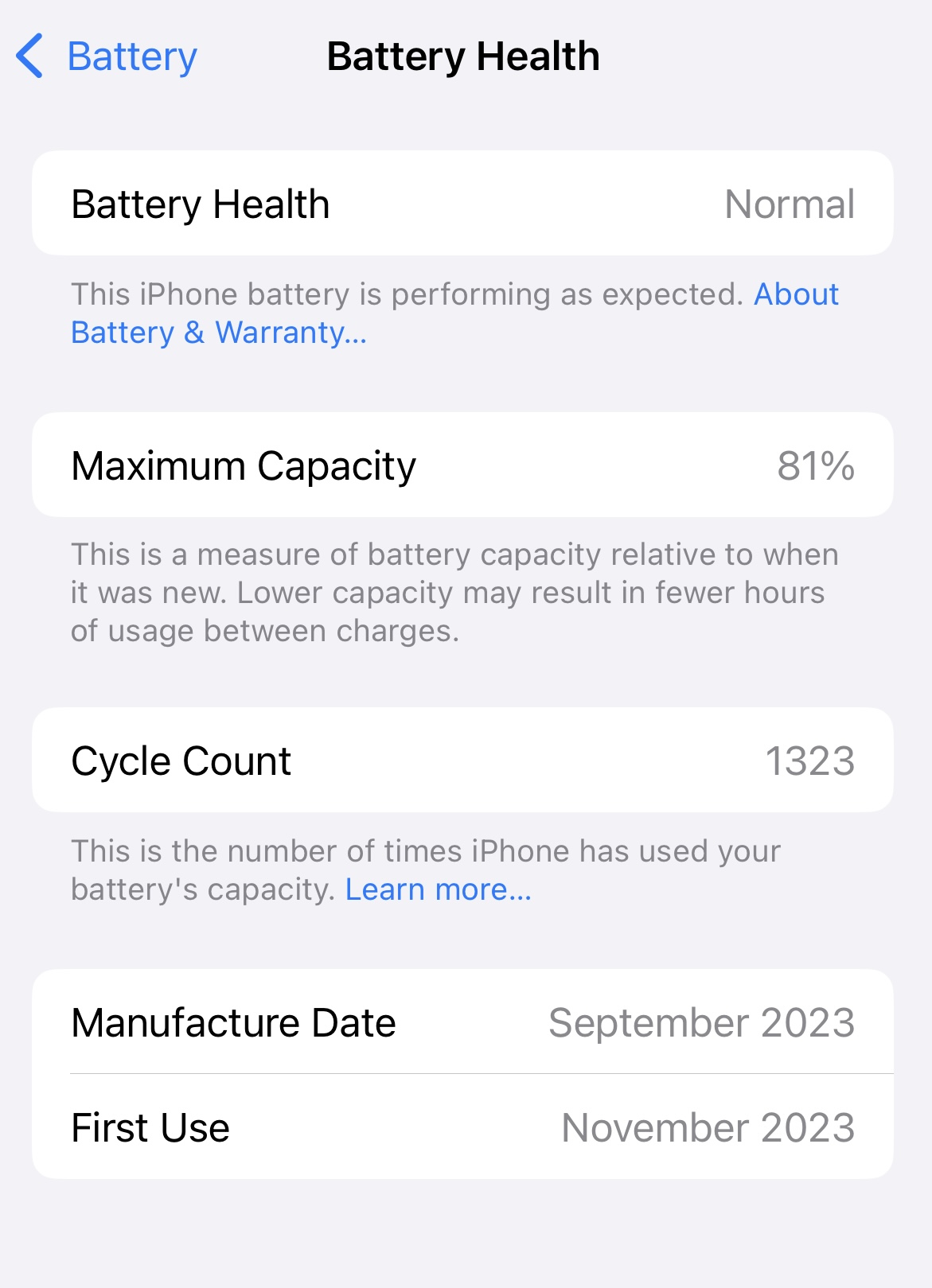 A bad battery from the start? I didn't even know you could have such differences in battery performanceAnother member has 846 charging cycles. I’m at 746 cycles with 81%. I run it down to 0% and charge it back to 100%. I’m charging it twice a day now. I just have a bad battery.