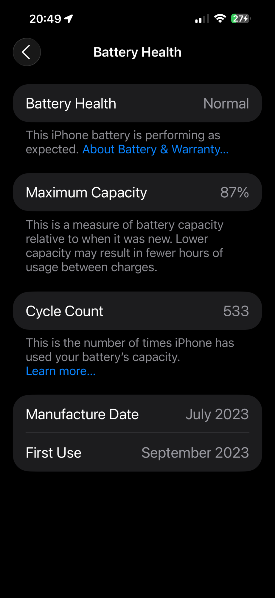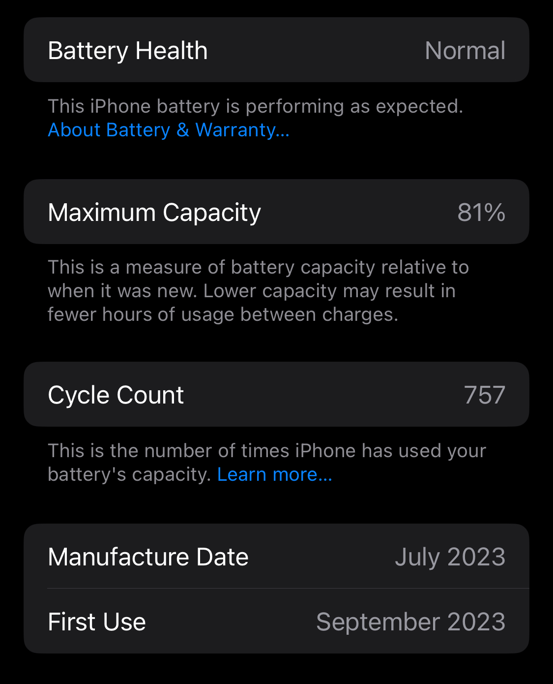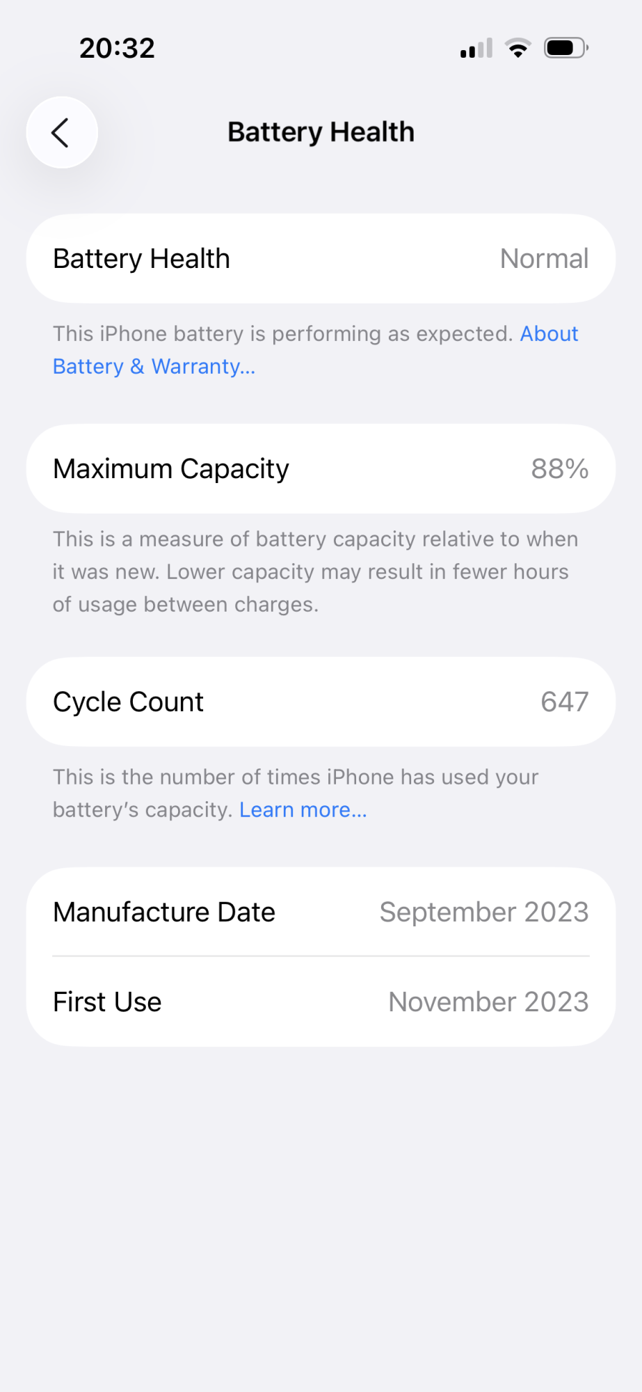 Did you buy this new? Interesting you were able to buy it Nov 2024, after the iPhone 16s had already come out... Very few cycles in 10mos!Here's the battery health for my iPhone 15 Pro Max, purchased November 2024.