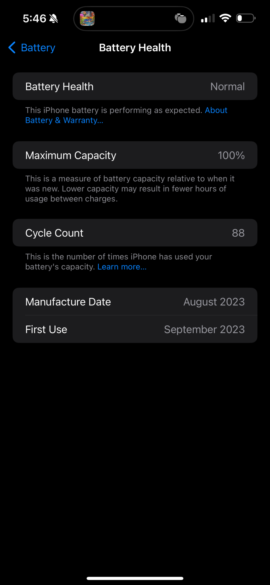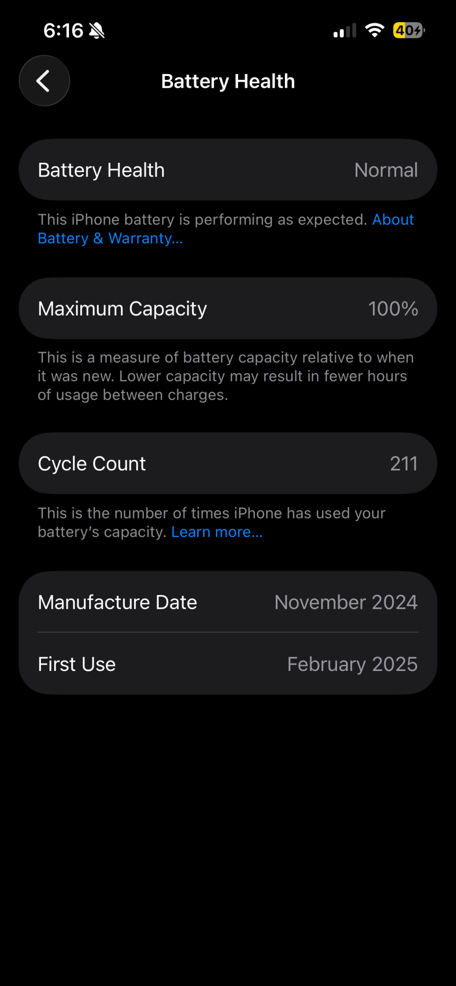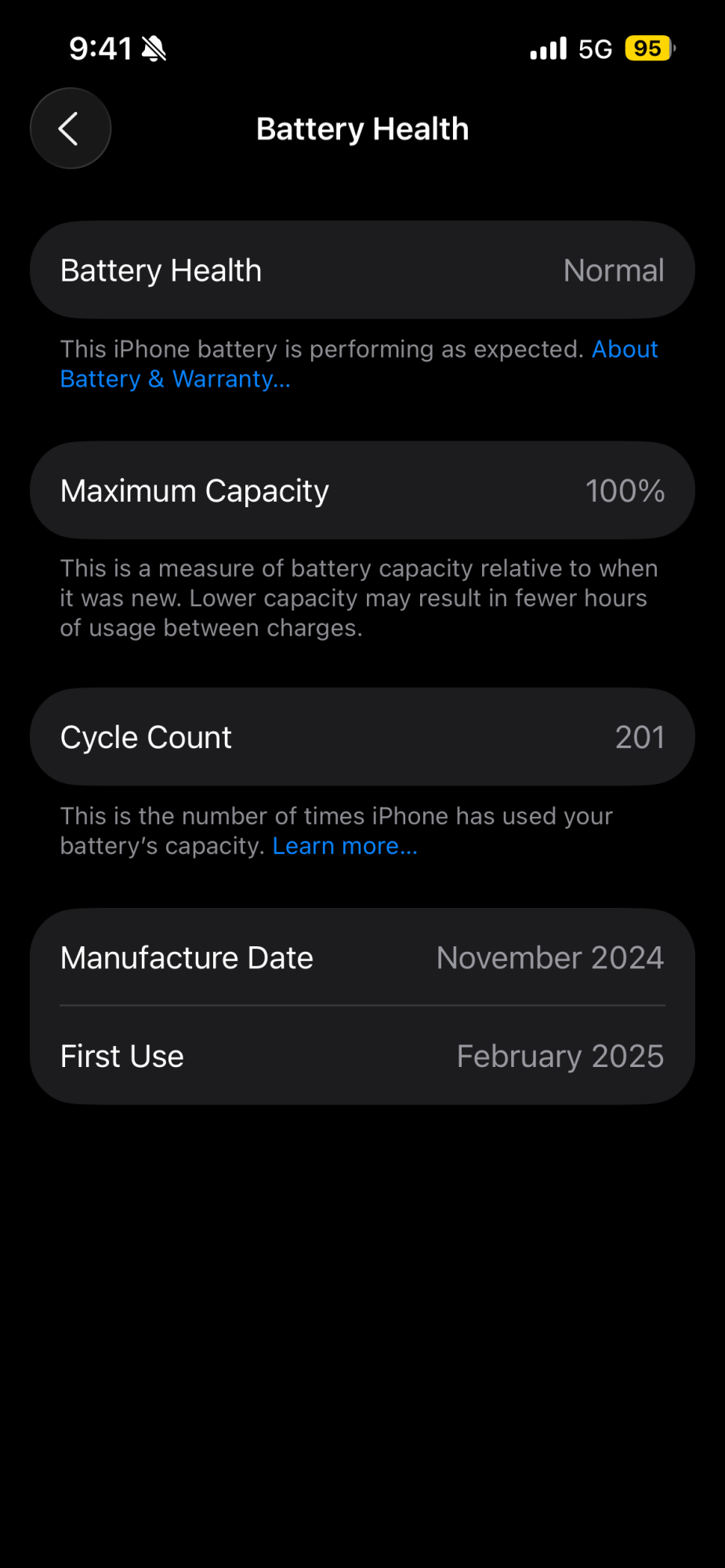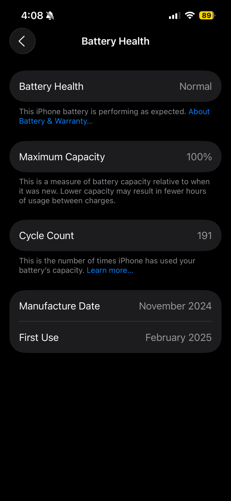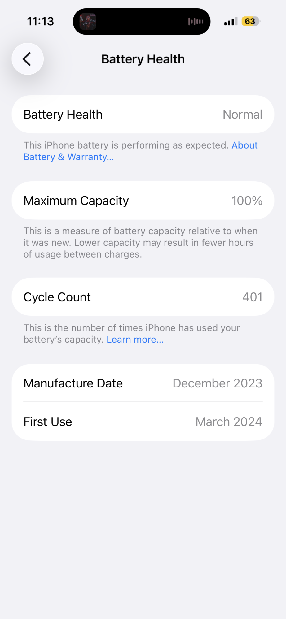 THAT'S ALMOST A RECORD ! what vintage is your phone ?In 2025 I still have 100bh with a cycle count of 405