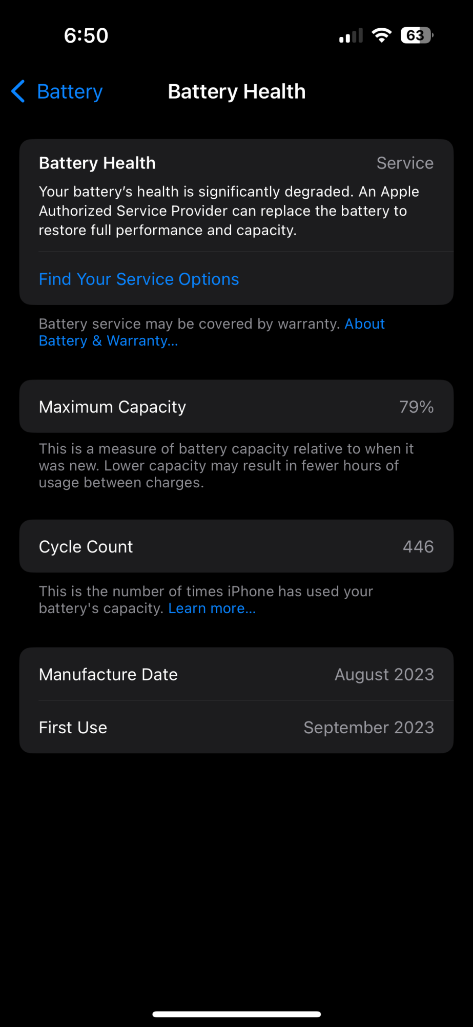 So far my 15 Pro’s battery health is showing at 80% for the longest time at 445 cycles (before it nose dived).