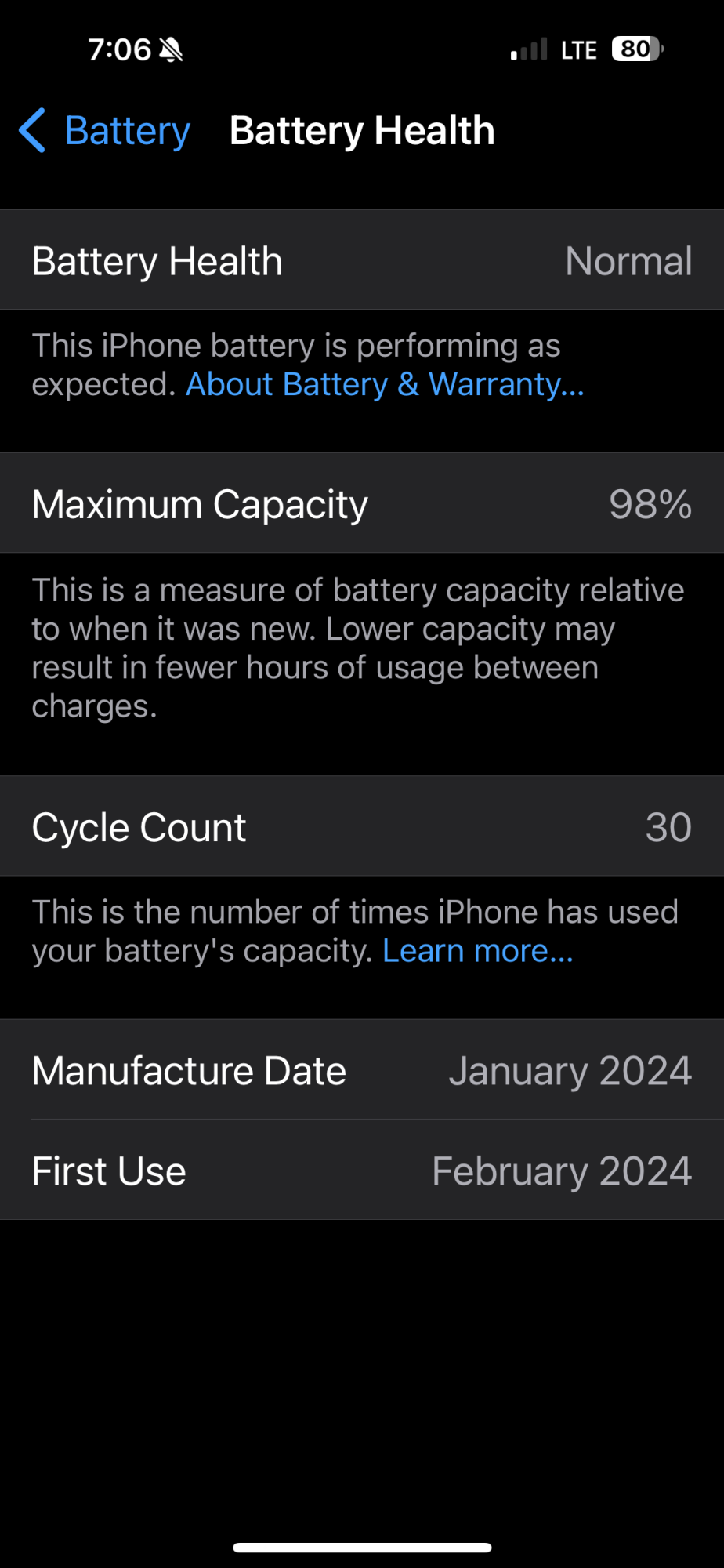 Mine just hit 98% with just 30 cycles. Less than 6 weeks of use. Safe to say I did not hit the battery lotto