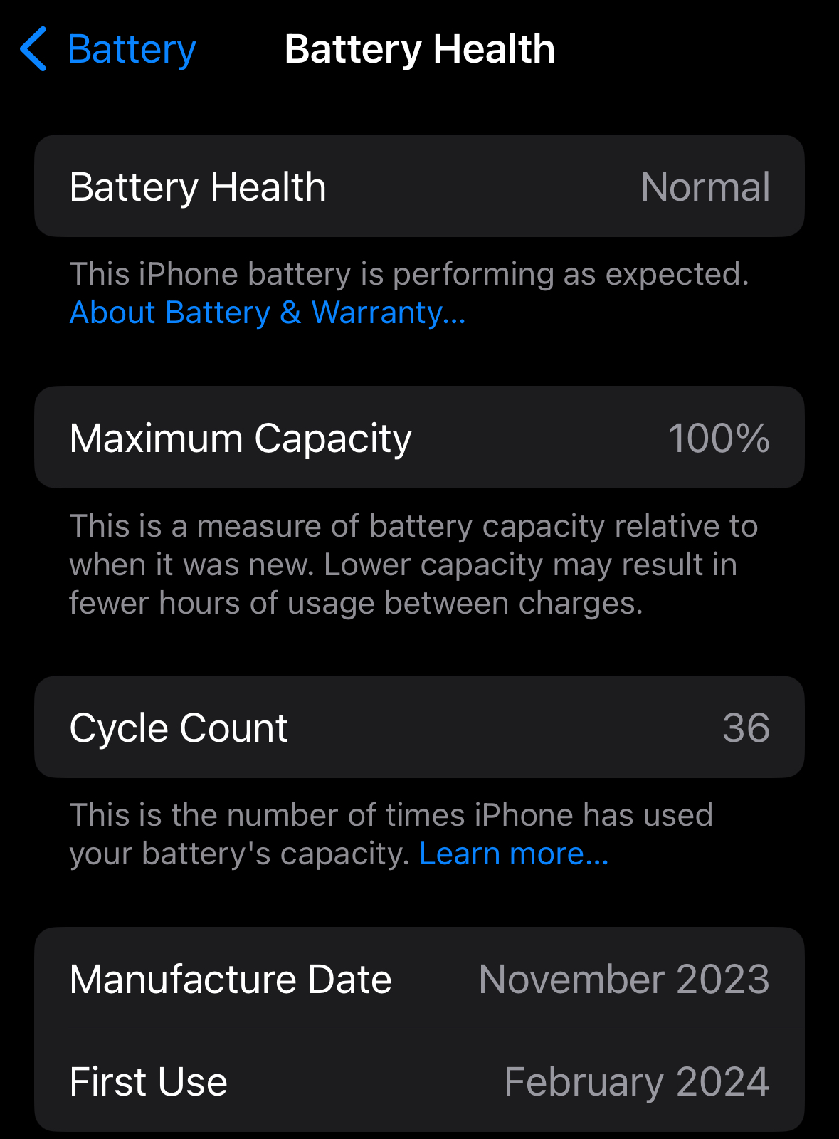 Caveats… Another mAH down today with real battery stats reporting 3279. Getting closer to the rated from factory 3274mAh on the 15 Pro.