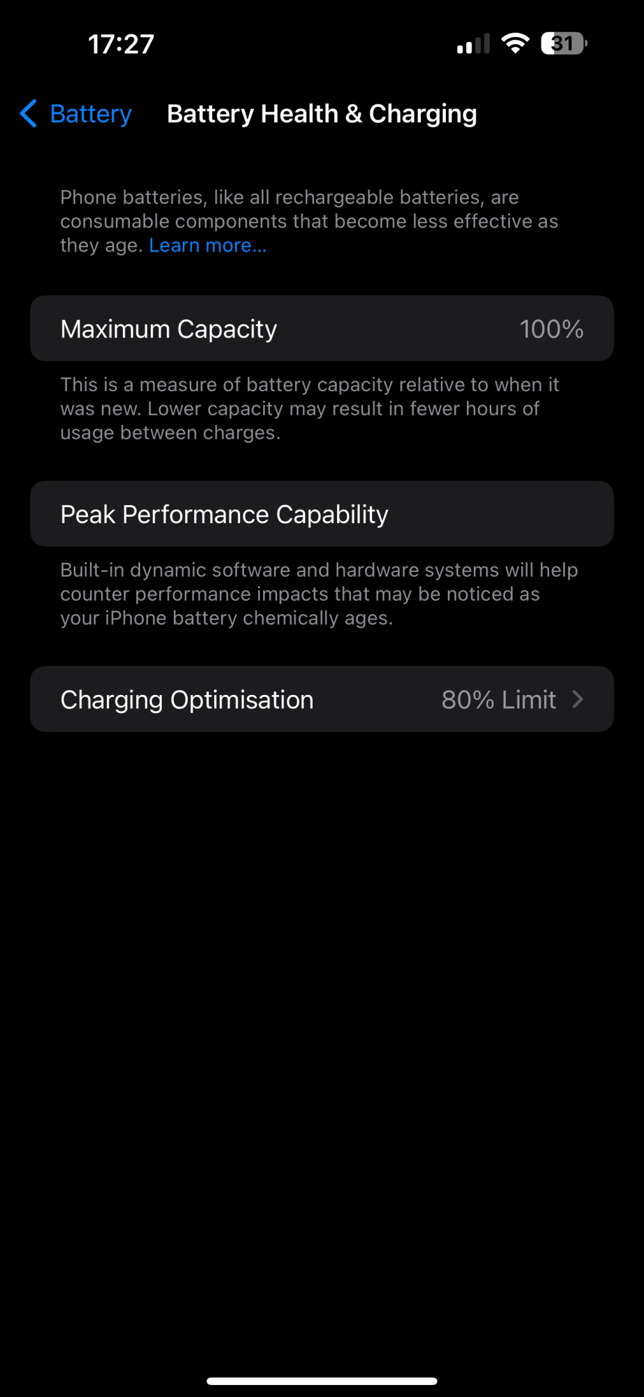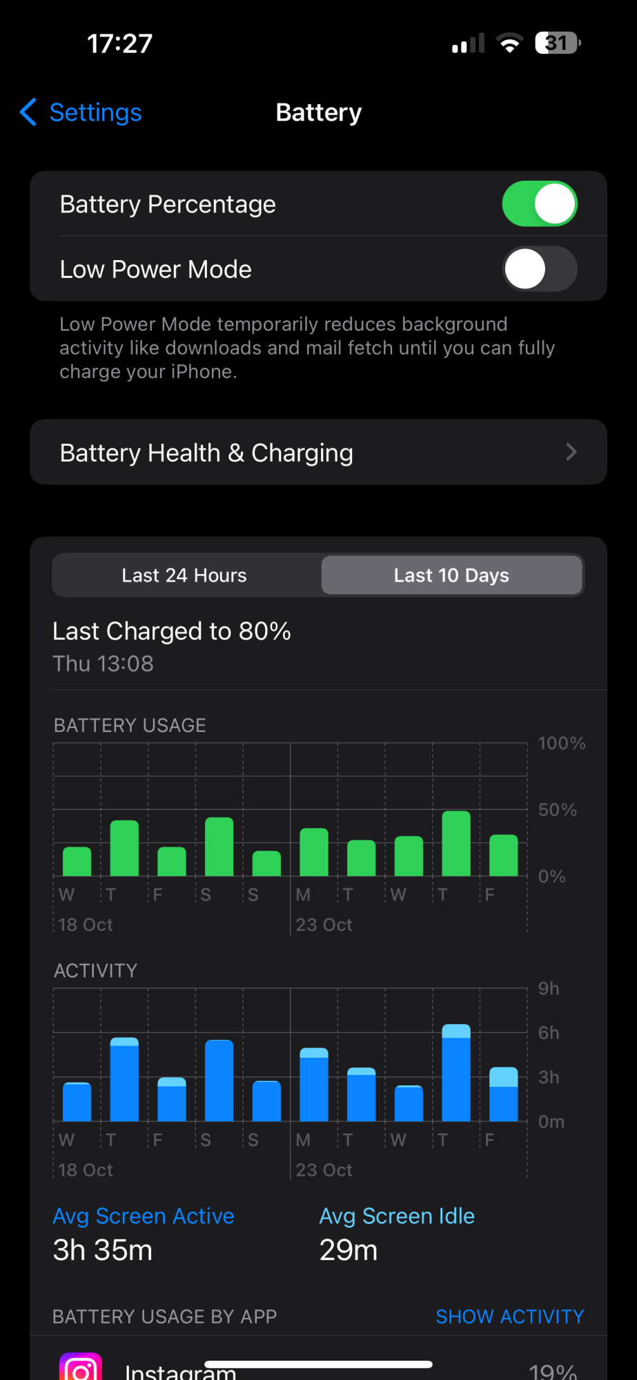 i have charging set to 80% limit and always charge when it gets to 20-25%. despite "losing out" on ~40-45% battery life the battery life is great for me. i last charged to 80% at 13:08 on Thursday so it has been just over 28 hours since being charged (it's now 17:19 on Friday). I'm currently at 31% charge.