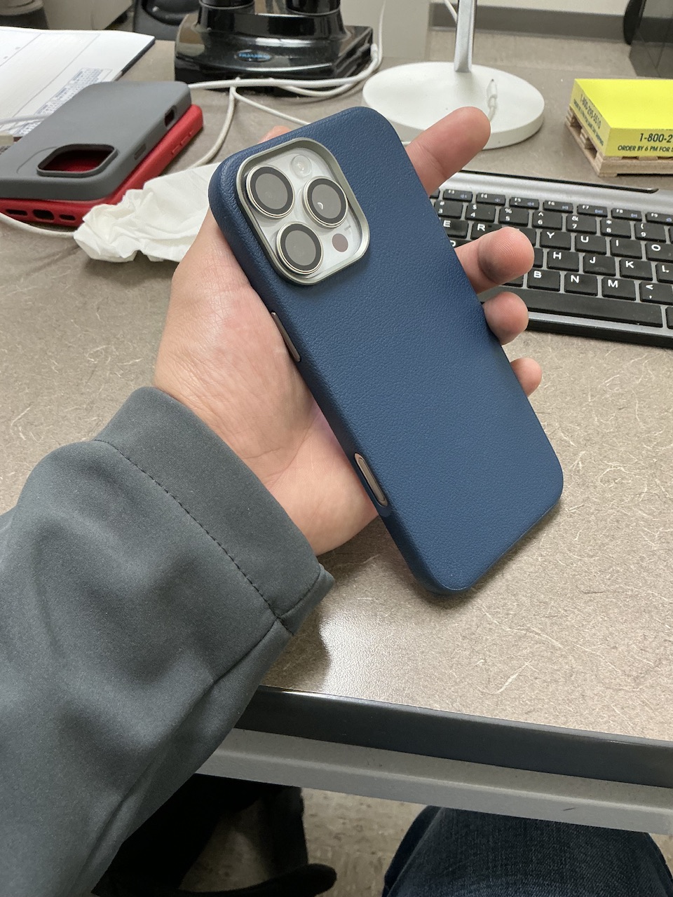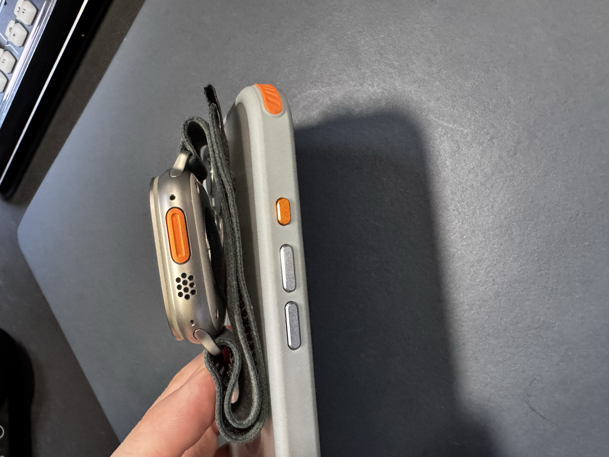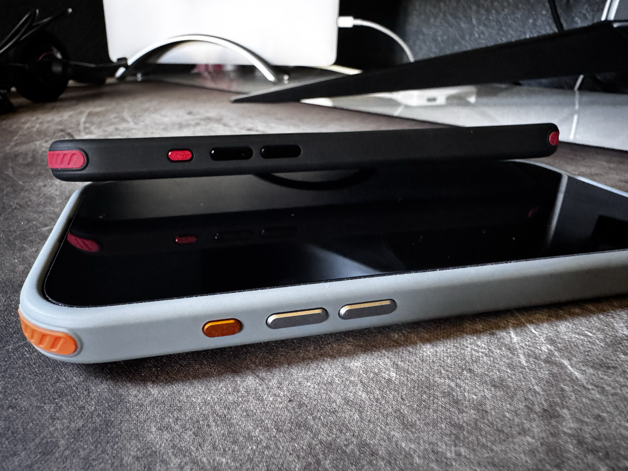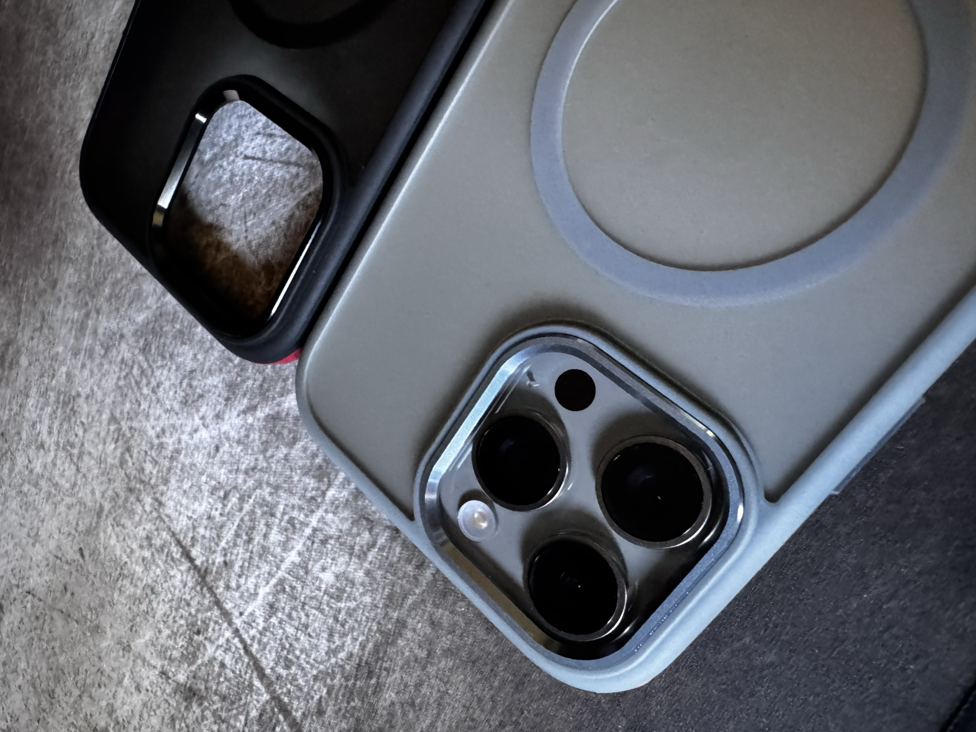 The camera control cutout is fine - not ideal, as it's not tapered so the button is a bit recessed, but I'm still able to half- and full press without any significant difficulty. And it's actually a good place to anchor the tip of my ring or middle finger while holding the phone one-handed; accidental presses of the camera control are quite unlikely. The metal buttons are nice an clicky, and while perhaps not as smooth around the edges as the buttons on my old Apple leather case, they're by no means sharp, and I like that both they and the camera surround are also blue.