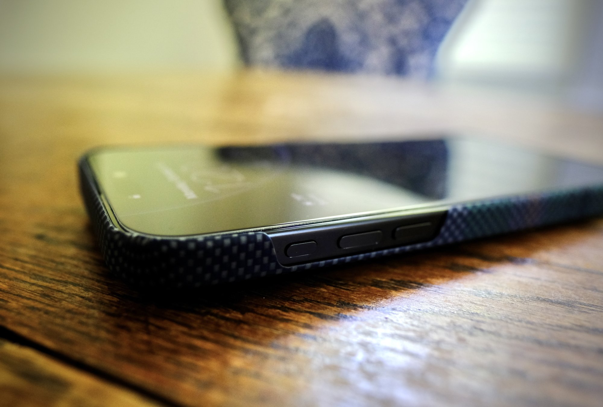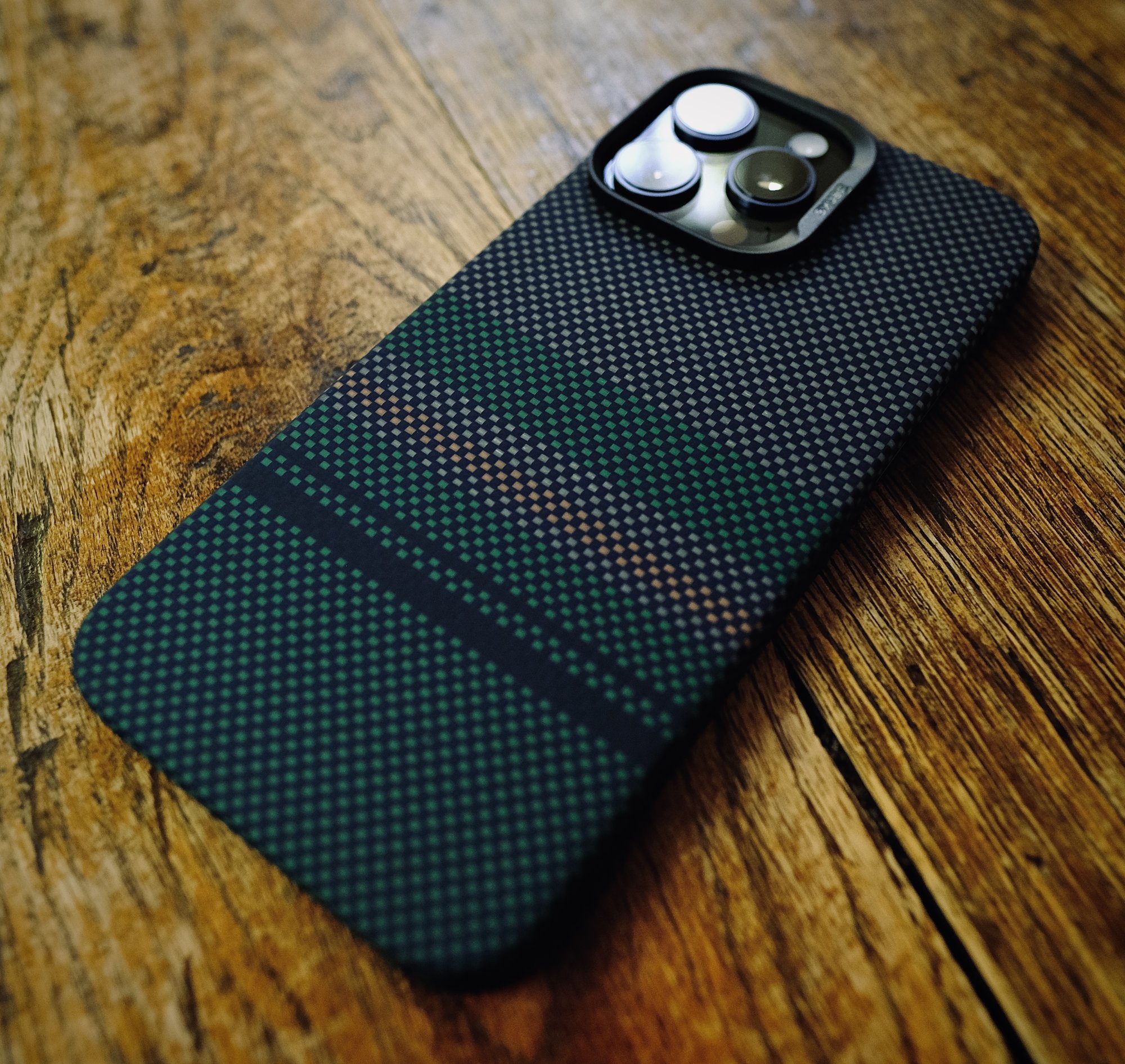 Here’s the Benks ArmorAir Aurora, another ultra-thin case that’s very similar to the Pitaka Tactile Woven. This one weighs 29 grams, while the Pitaka weighs 24 grams. Though it’s subjective, I find the Pitaka slightly more refined: the corners are a bit smoother (the Benks has slight wrinkles), and the finish on the camera ring and the interior is cleaner. The Benks has the advantage of subtly raised corners for laying the phone face down, while the Pitaka has zero lip. However, I’m not a fan of the black metal camera ring, which—if it’s like every other black metal ring I’ve had—will likely wear down and expose the metal underneath fairly quickly. The Benks is certainly the better deal, and both cases are equally nice overall, but if I had to choose, I’d probably go with the Pitaka.