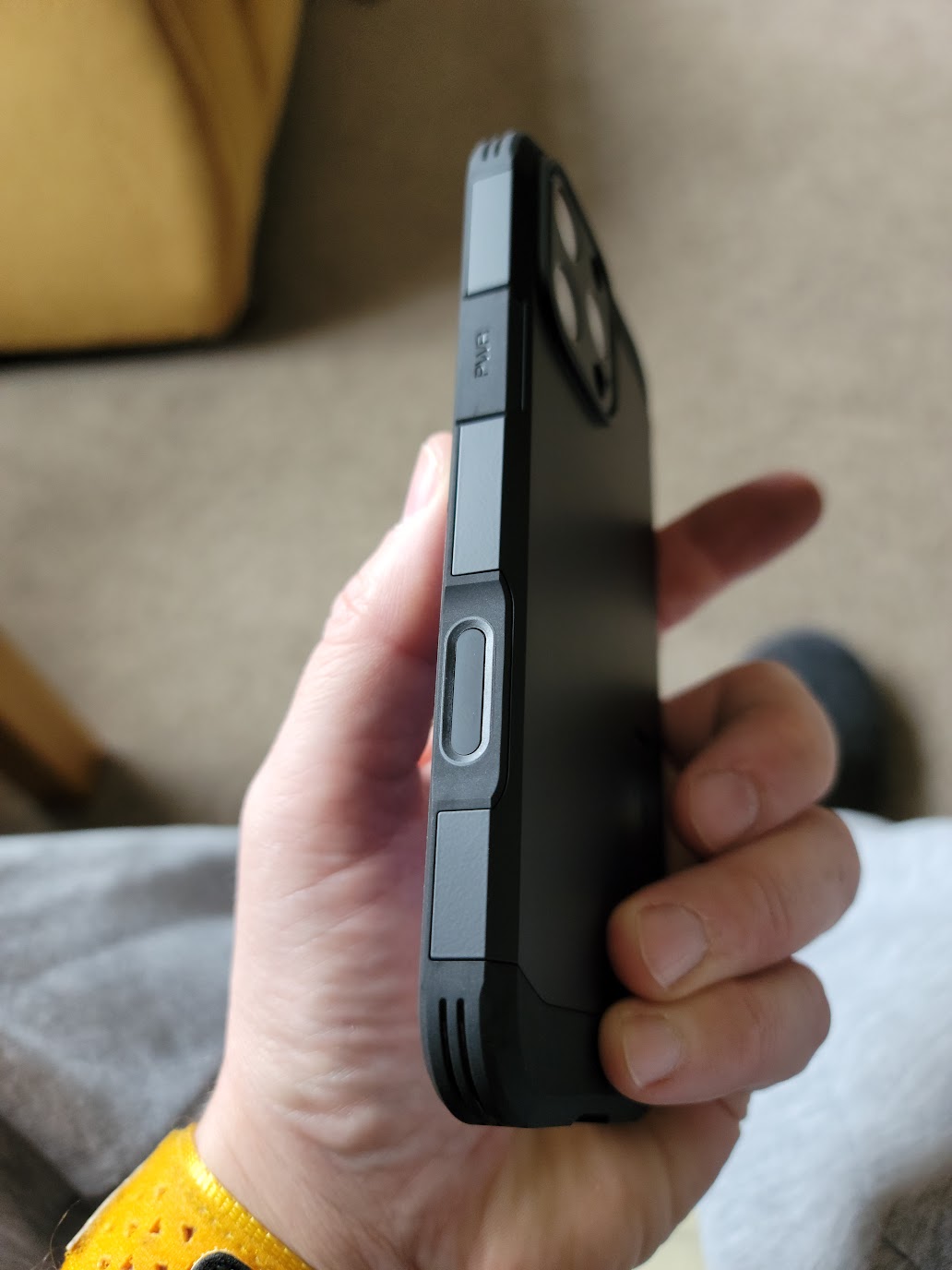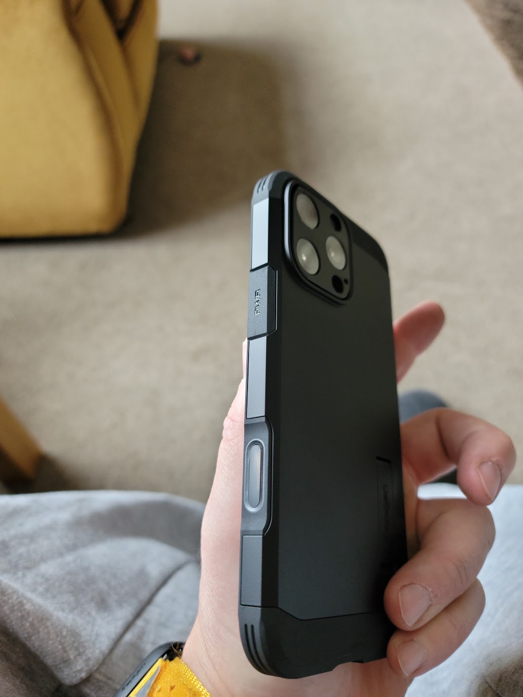 And now for something completely different. This beast is the Spigen Tough Armor T AI (they need to work on their names). It’s Spigen’s other case that has a capacitive Camera Control cover. It weighs a whopping 57 grams, twice as much as the svelte Pitaka and Benks cases I posted earlier today. Of course, it’s also far more protective. It actually feels pretty good in the hand, though it makes the phone noticeably wider and heavier. The buttons are good, the fit is good, the edges are stiff, and the CC cover works as well as the cover on their Ultra Hybrid T. This case is proof that it’s possible to make a super beefy case that still has a comfortable, fully functioning Camera Control cover (Mous, are you listening?). It’ll be interesting to see how it compares to the Otterbox Defender Pro with Camera Control that comes out later this year.