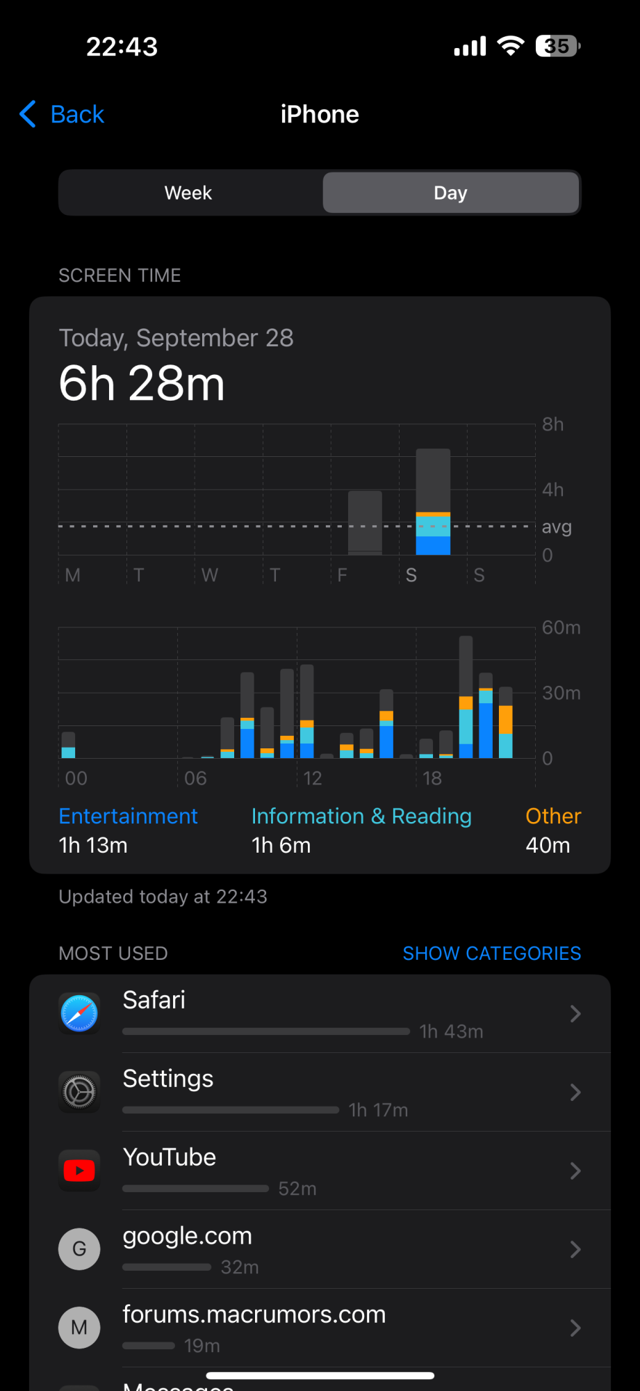 You can see on wednesday in graph I get 14 h in 98% of usage but in same apps Today I get 7 hours sot in 75% I cant understandI wouldnt look for better than your screen time.