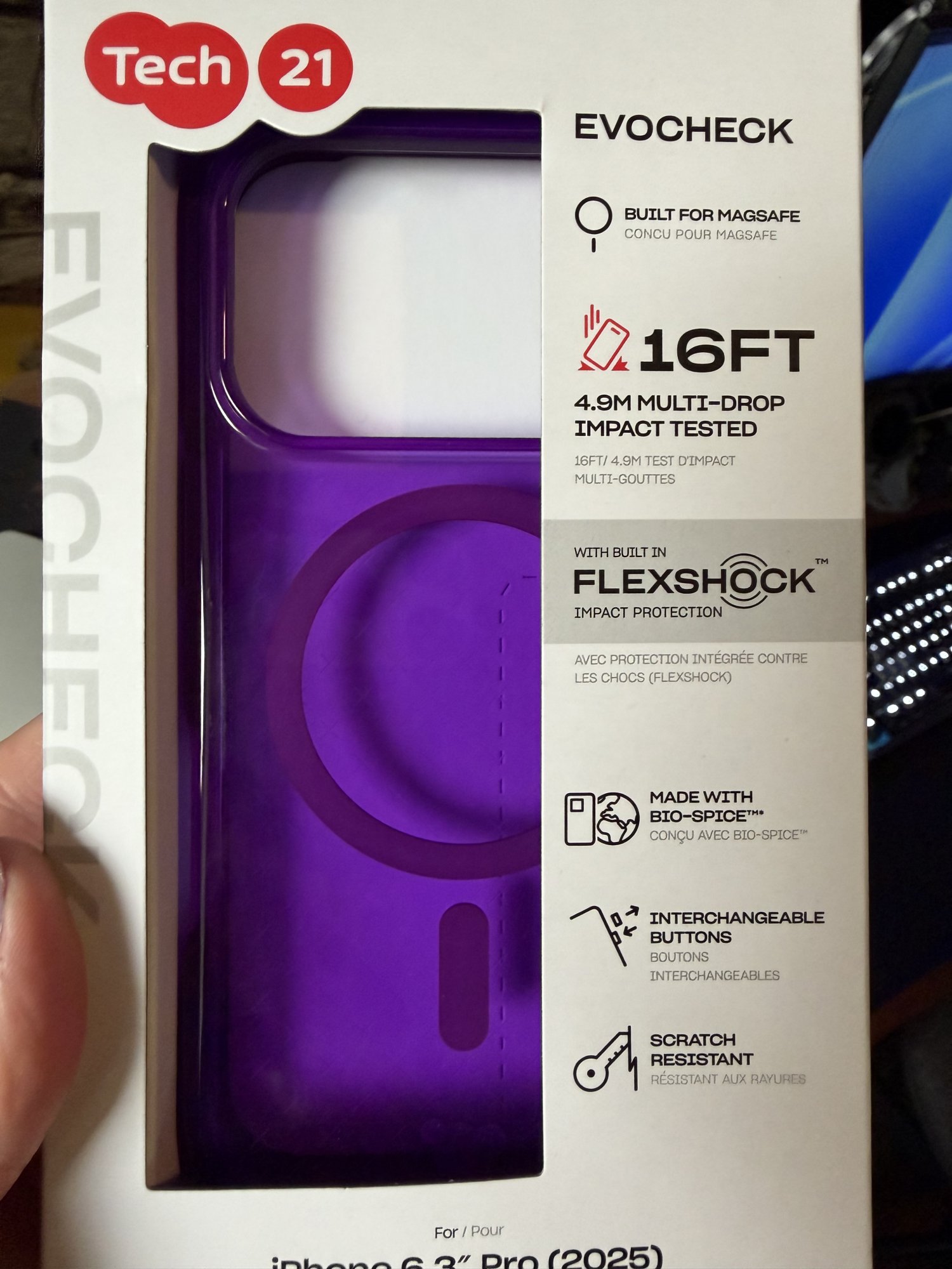 I have had Tech 21 for several of my previous phones and they do a really good job of protecting the phone. I didnt know they made purple though, I have only ever had the clear ones.Tech21 case arrived today. That thing is purple 😂 But if it does everything it advertises on the package I’ll be thoroughly impressed 😅 it feels really protective. Very flexible but closes around the front of the phone so I don’t think it would fall out when dropped. Air pockets all around the inside. Very sturdy, with matt sides and a glossy black. No camera control button, though. That is one downside.