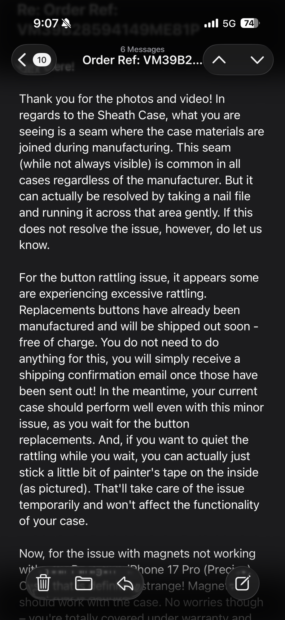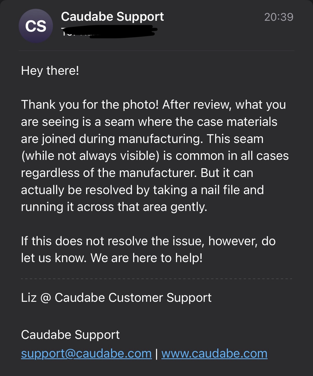 Honestly, I wasn't mad that there was a delay, I wasn't mad (just sad and disappointed after the long wait) both Paragon and Sheath cases I received were faulty. But telling me as someone who had Mous, UAG, Spigen, Otterbox, Apple, DBrand, Speck, Nomad, Ringke, Tech21, Rhinoshield and many other brands that having a pointy seam that cuts trough my hand is normal, that it is normal having it just on one side (on volume button side that seam is visible but I can't feel it under my hand as it should be all over), that button rattle is normal and even Apple cases have it (btw my buttons don't rattle so I guess it is not normal) instead of admitting it is a faulty unit and then even telling me to use nail file to fix it. Wow. It's really becoming hard to have understanding for their excuses and to keep supporting the company.