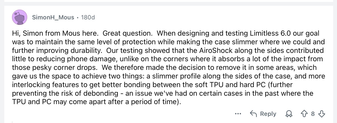 Mous claims that by removing the TPE (AiroShock) along the sides they were able to reduced the thickness of the sides by ~25% without significantly affecting protection. You can see it in your last photo, where the side on the 15 model is sort of rounded, whereas the side on the 17 model is more flat. Here’s a note from the Mous rep:
