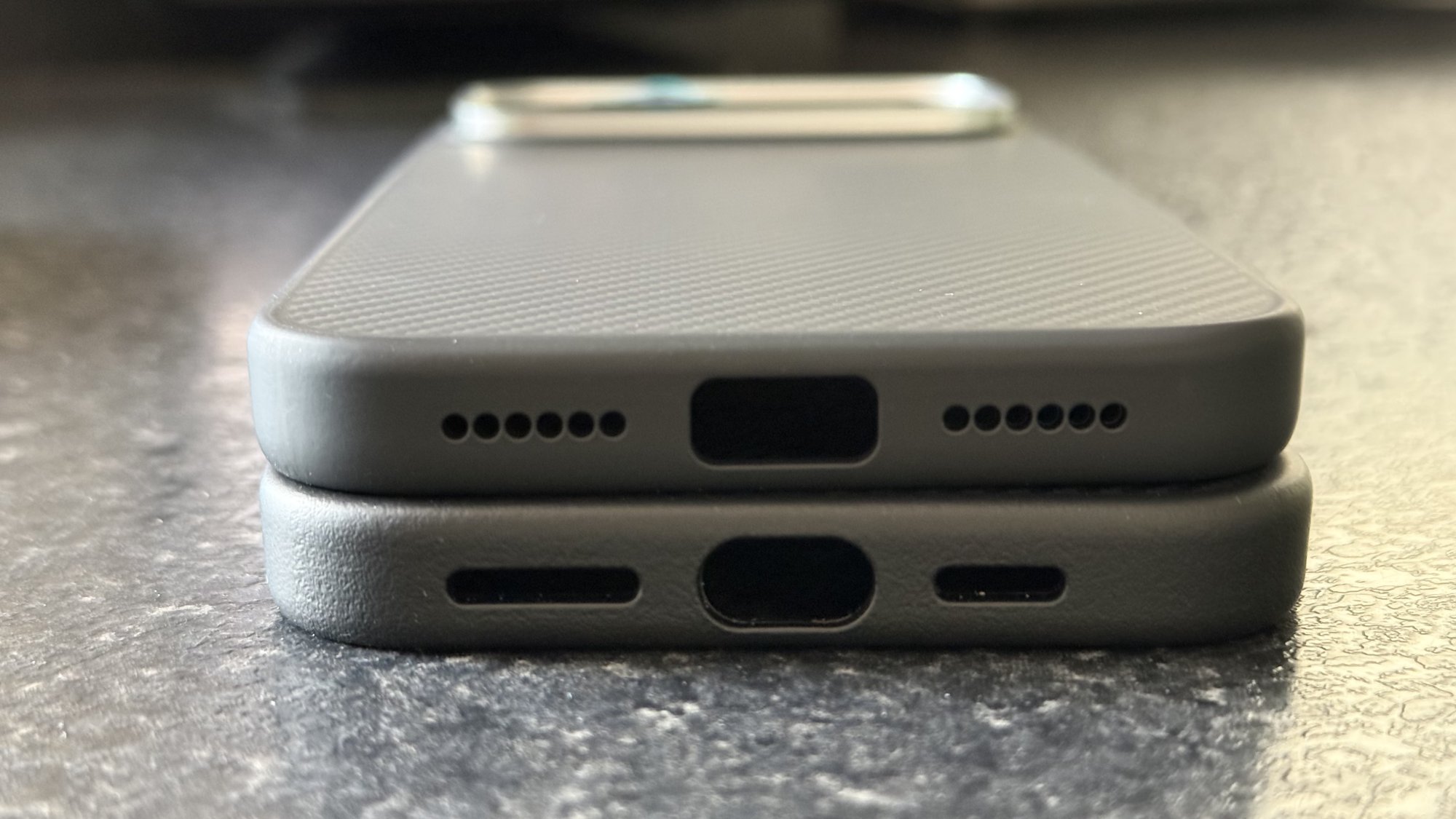 The bottom cutouts are different to last years. The cable port is squarer and the speaker/mic cutouts are now individual. Looks like the holes are even both sides on the 17 if they match the case.