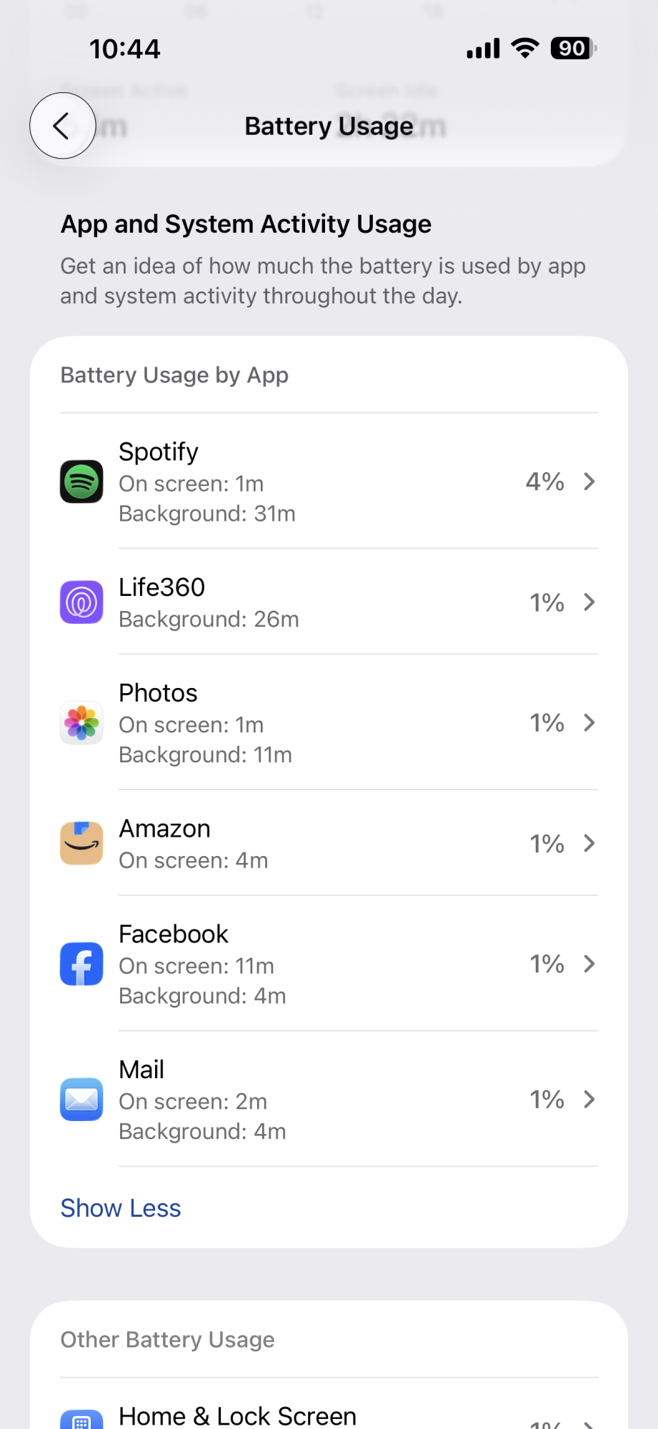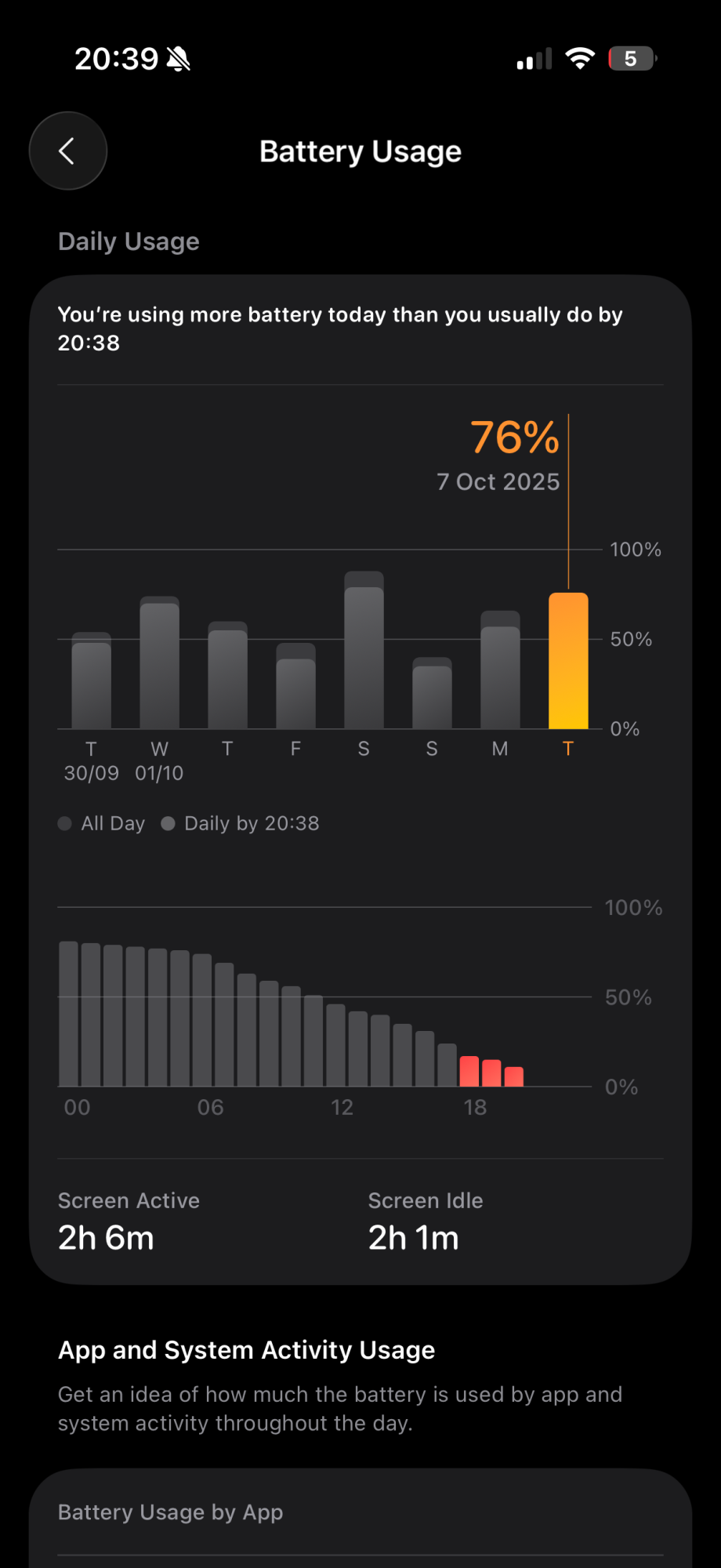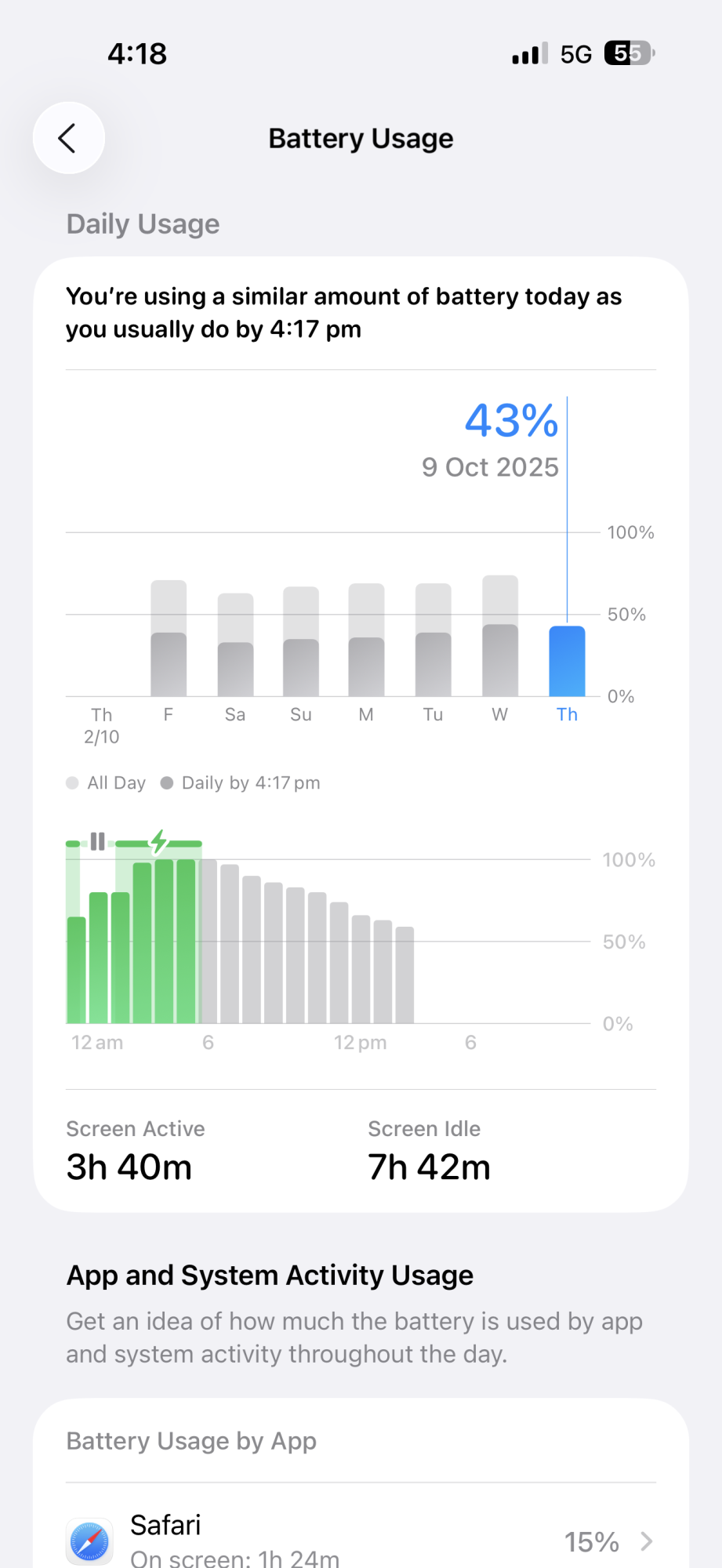 An hour or two is streaming Apple Music on 5G. The individual background time for each app don’t add up to the total so not sure what’s going on.Your screen idle-time seems very high.