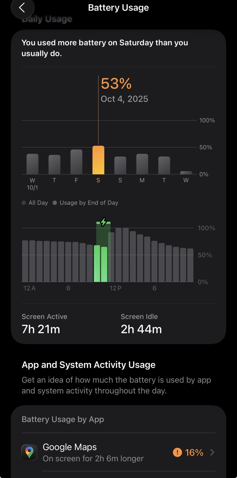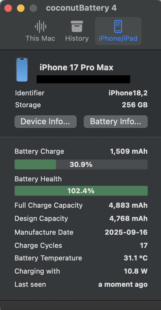 However, if I'm being honest, I don't feel as blown away by the battery life as I thought I would. I'm coming from a 3 year old 14 Pro Max with 85% battery health, and it used to get me about a day and a half, ending most days with around 50% from a full charge. The 17 Pro Max is a definite improvement, but I kinda feel like it's not that different than my 14 PM was when its battery was new, even though by every metric a new 17 PM should blow away a new 14 PM in battery life.
