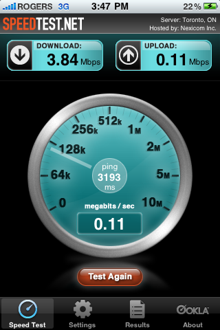 ok here are my results on 3G which we just got in my town today !!!!!!! 1.48 down .19 up then 1.31 down .25 up and on my Wifi i get .70 down oh and i am on 3GS .13 up how the hell is 3G faster than my wifi ?