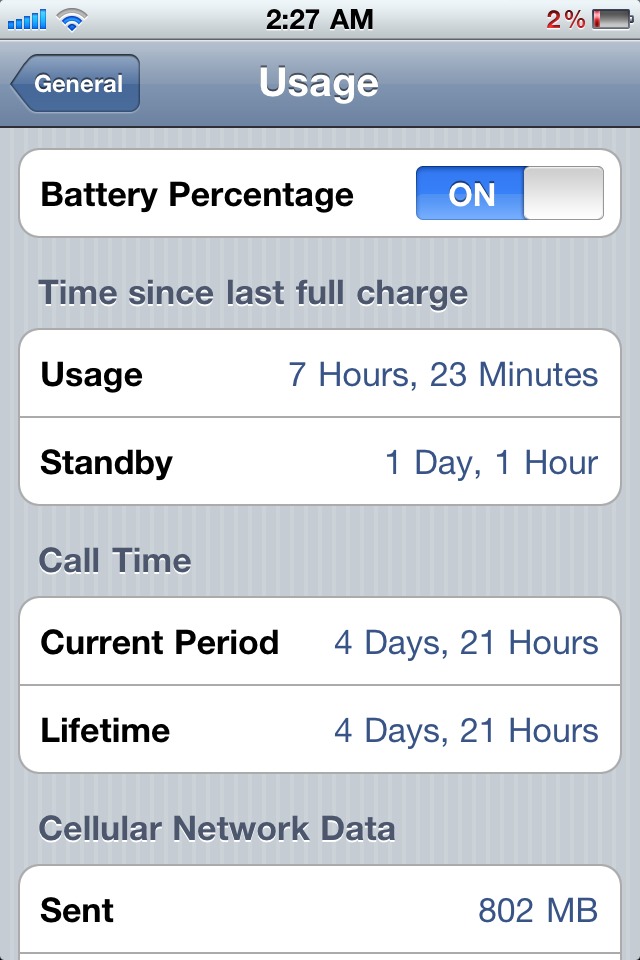 Sun, March 6: Usage: 4 Hours, 30 Minutes. Standby: 13 Hours, 35 Minutes. 2% Left.