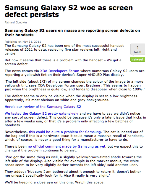 The iPhone 4 has gotten a lot of media attention over this, and now Samsung. The displays are coming out a washed out yellow tint, usually on the left side of the display or the whole phone.. I don't know if any other people have seen this report yet: