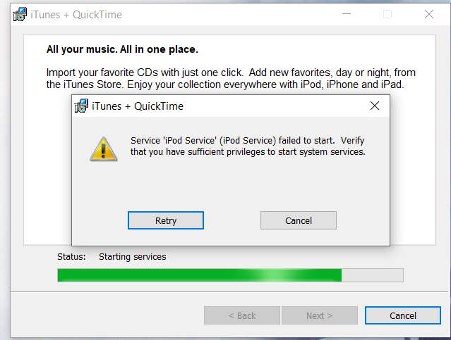 I uninstalled my iTunes and reinstalled it. It still won't work. There is no response. I did an internet search. I noticed that Apple has an iTunes version for the iPhone 4 and Windows 10. It is the 9.2.1 version. I checked to make sure that my HP laptop computer has the 64 bit Windows. It does. I attempted to download that iTunes version (iTunes 9.2.1 for Windows 64 bit), but it won't install on my computer. I tried multiple times. Every time I try, the installation crashes before being completed. And I get a strange message ("...verify that you have sufficient privileges..."). The iTunes icon momentarily appears on my computer, but then it vanishes. A Quick Time Player icon appears on my computer. That appears to install successfully, but the iTunes won't install.