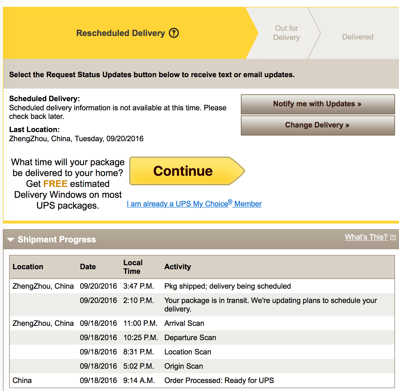 So 422 pages in and I caved... I signed up for this forum. Quick question. 128GB Matte Black + (Verizon). Original dates were Oct 4-10. I went into preparing for shipment on Saturday and my card was charged same day. Kept looking for UPS info via track by reference trick (phone number and order number showed nothing). Today, my phone number shows nothing, but my order number comes up. However, it says destination is Toronto, ON, CA... I live in Jersey in the States. How is this possible? It is coming from ZhengZhou and just arrived there 1:05AM local time on 9/21. Says delivery expected Friday, 9/23. Could this be my product with a bad address? Or do the delivery labels not get loaded until Apple officially tells me the product has shipped? New to this whole process. Lol. Any help would be greatly appreciated. Thanks!!!