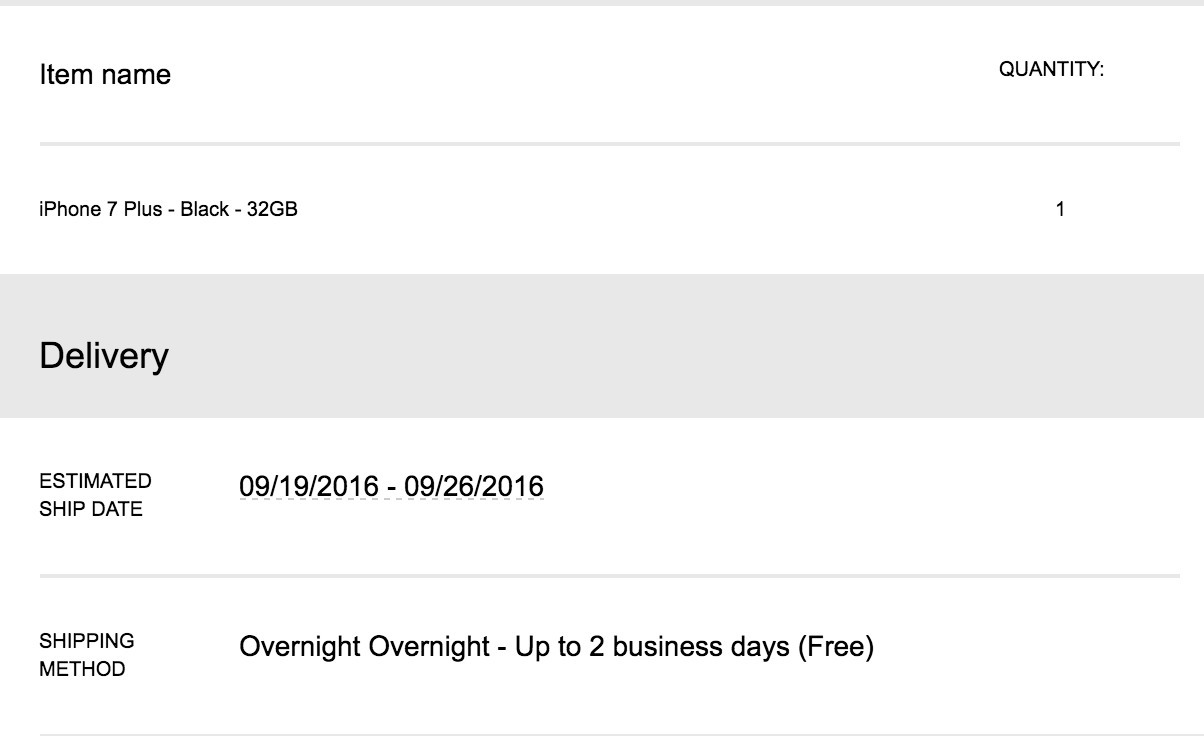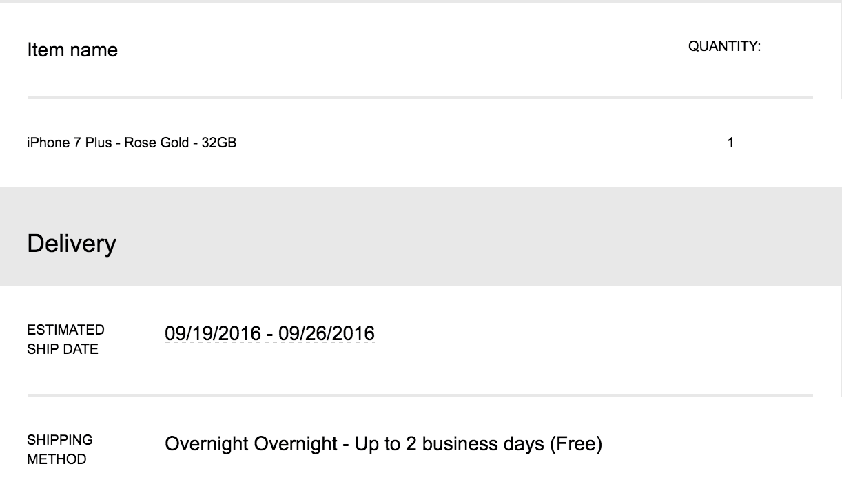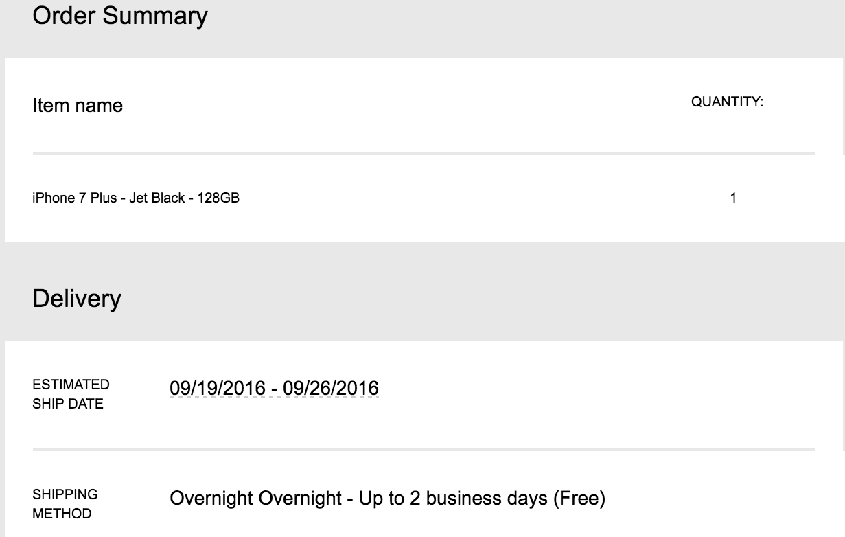 Ordered the the Black and Jet Black phones at 12:02 AM (Pacific) on the phone. When the lady tried to process the 3rd order for the Rose Gold, her system took a dump. Took a nap, woke up at 3:30am (Pacific) and was able to get the Rose Gold ordered. All phones have the 9/19-9/26 ship quote.... but I am 99.999999999% sure it is just a placeholder and I am good for launch day. I believe it was the same way last year.