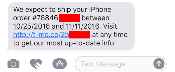 Also, about an hour after it was delivered, I got this text message from T-mo: