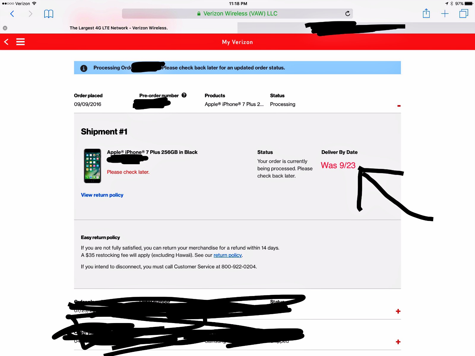 Check the preorderwireless site. It's probably being shipped....Well here it is 11:27pm EST and of course I checked Verizon to see that my shipping date of 9/23 has been removed. So of course I go to check my card and the payment has gone through. Am I looking for my phone tomorrow, no. However I'm just glad to see some changes indicating I might get my phone before next Friday. Oh and I preordered on 9/9 at 3:05am EST time. iPhone 7+ 256GB Black (Matte) View attachment 652783